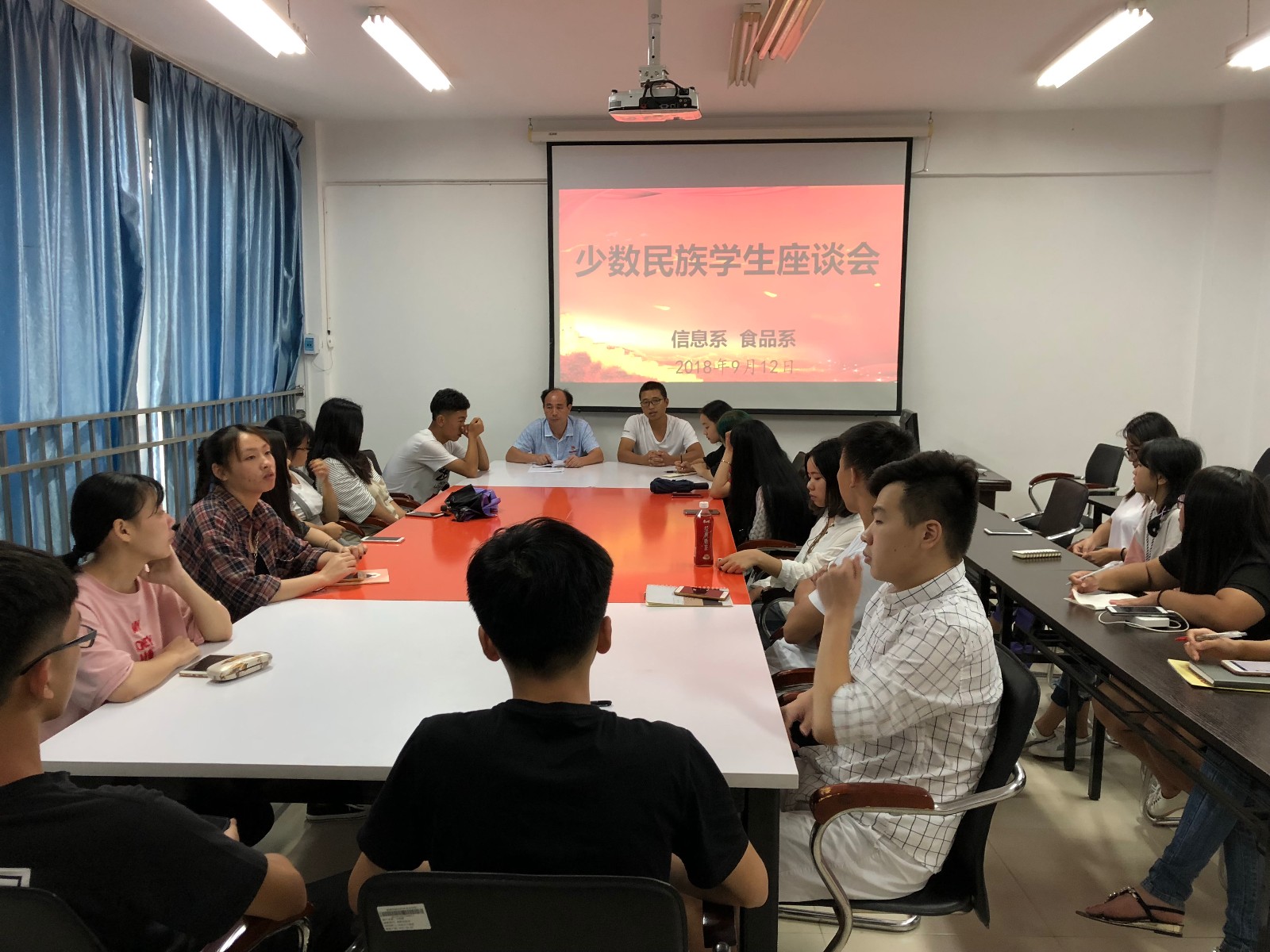 为切实做好少数民族学生教育管理服务工作,促进学生健康成长成才,帮助同学们解决在学习和生活等方面存在的实际困难和具体问题,9月12日中午,信息系和食品系召开了少数民族学生座谈会,系党总支委员、学生科全体人员、学生会干部及16名少数民族学生参加了会议。