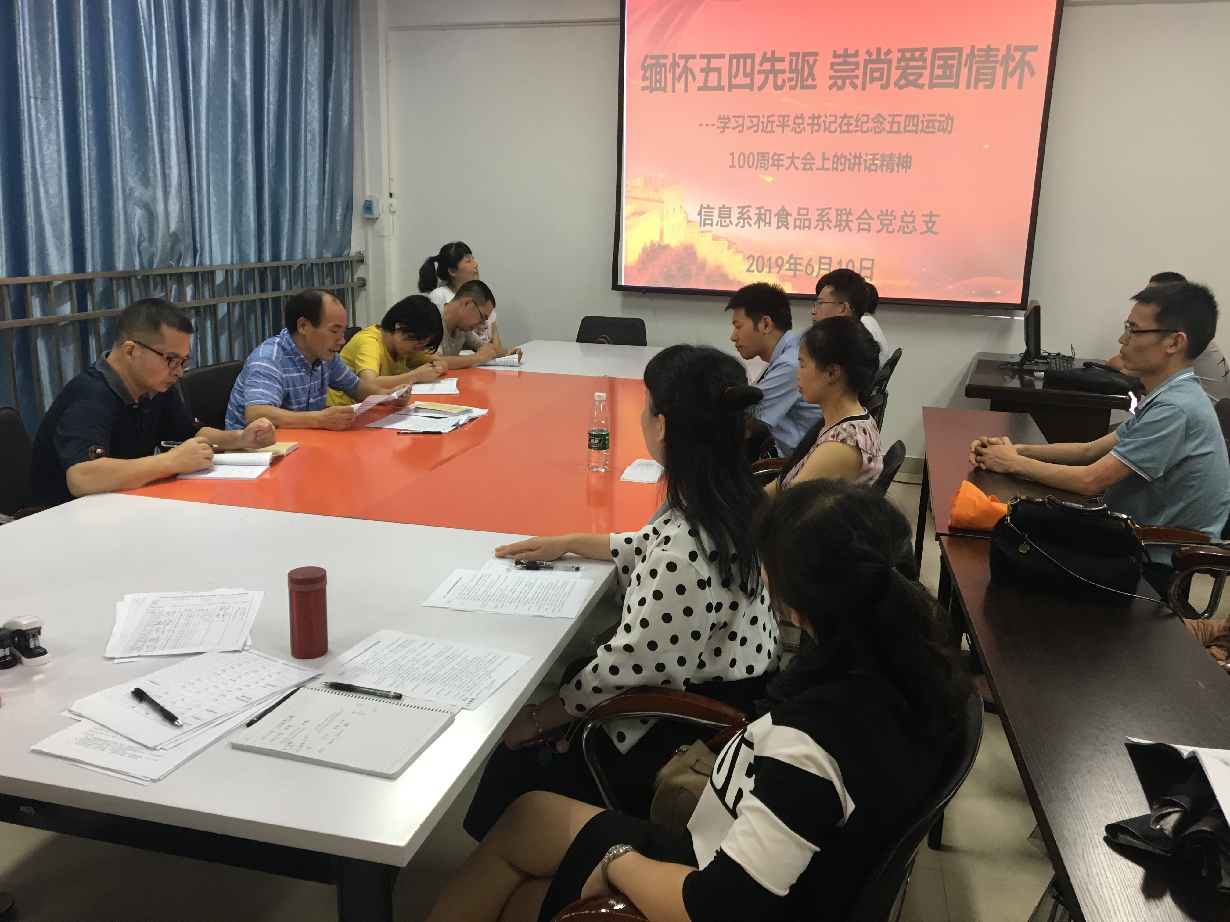 6月10日下午,信息系和食品系联合党总支开展了以学习习近平总书记出席“不忘初心、牢记使命”主题教育工作会议上的讲话精神及习总书记在纪念五四运动100周年大会上的讲话精神为主的主题党日活动,两系党员领导干部参加了学习活动。