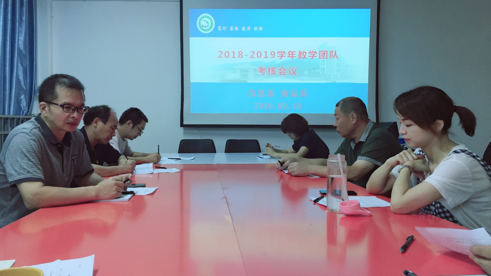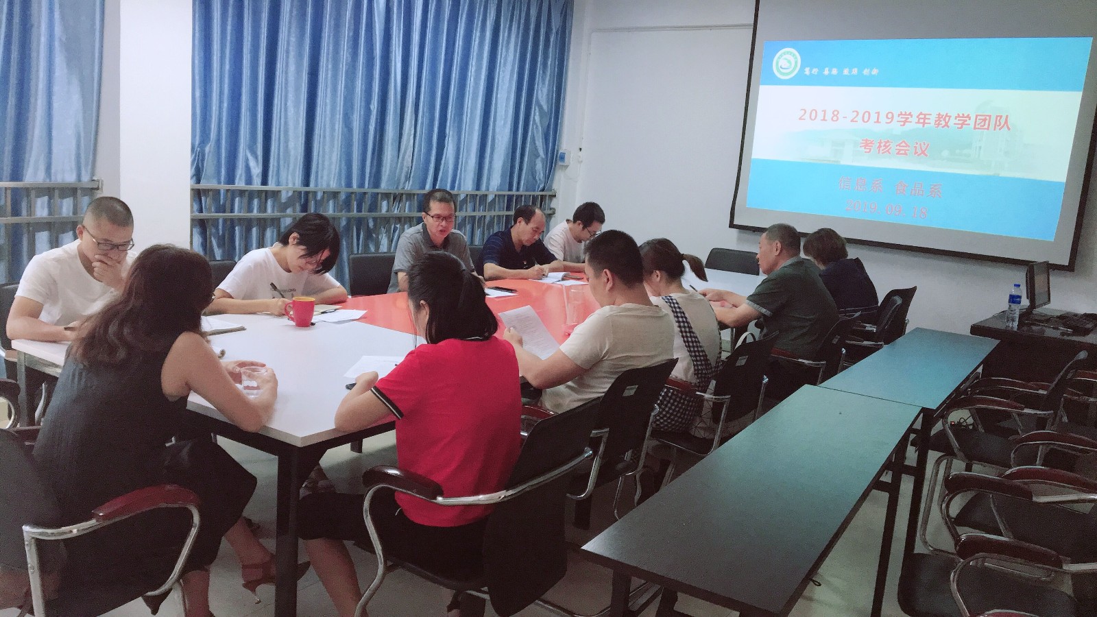 2019年9月18日上午,我系召开信息系和食品系2018-2019学年专业教学团队负责人考核会议。会议上,各专业的团队负责人对自己2018-2019学年的工作进行了总结汇报,教学团队考核小组成员对其工作的履职情况进行评议打分。