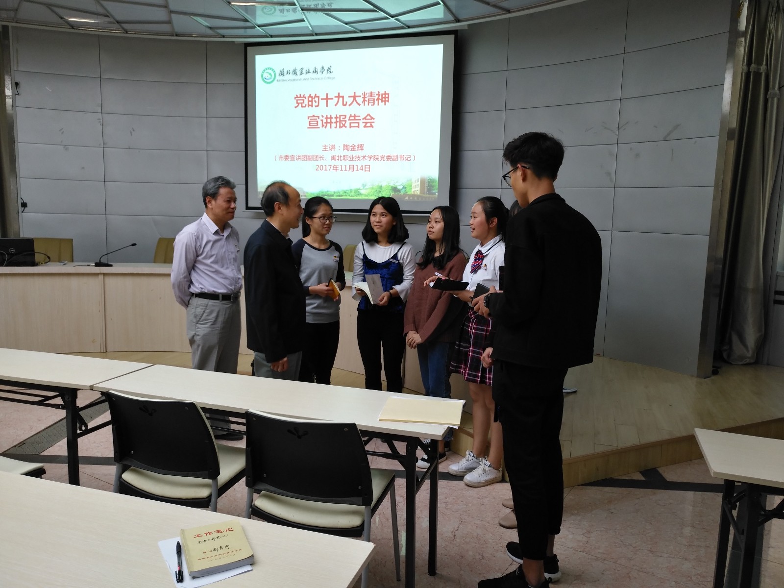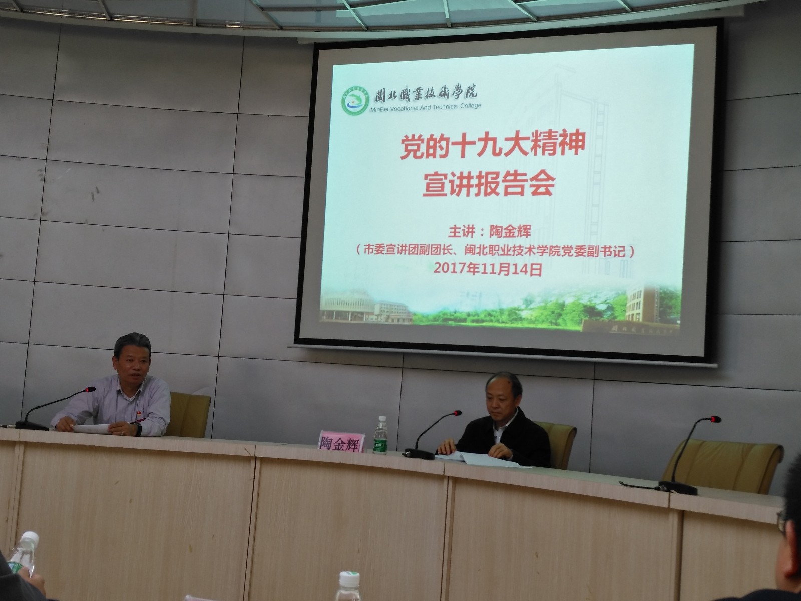 2017年11月14日下午,Beat365党的十九大精神宣讲报告会在行政办公楼一楼报告厅举行,南平市市委宣讲团副团长、院党委副书记陶金辉同志作了宣讲报告,院中层以上党员干部、各总支委员、支部委员、学生代表等70余人参加了报告会,我系主任、总支副书记张金良,系常务副书记郑启阶等出席了会议。陶副书记从“关于十九大的主题、成果”、“关于习近平新时代中国特色社会主义思想”等八个方面进行了宣讲。宣讲全面、到位,切合实际,全体与会人员对党的十九大精神有了更深入的认识。报告会结束后,陶副书记现场接受了学生的采访,对学生提出的问题进行了一一解答。