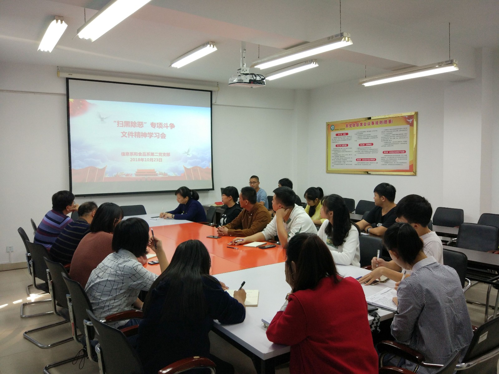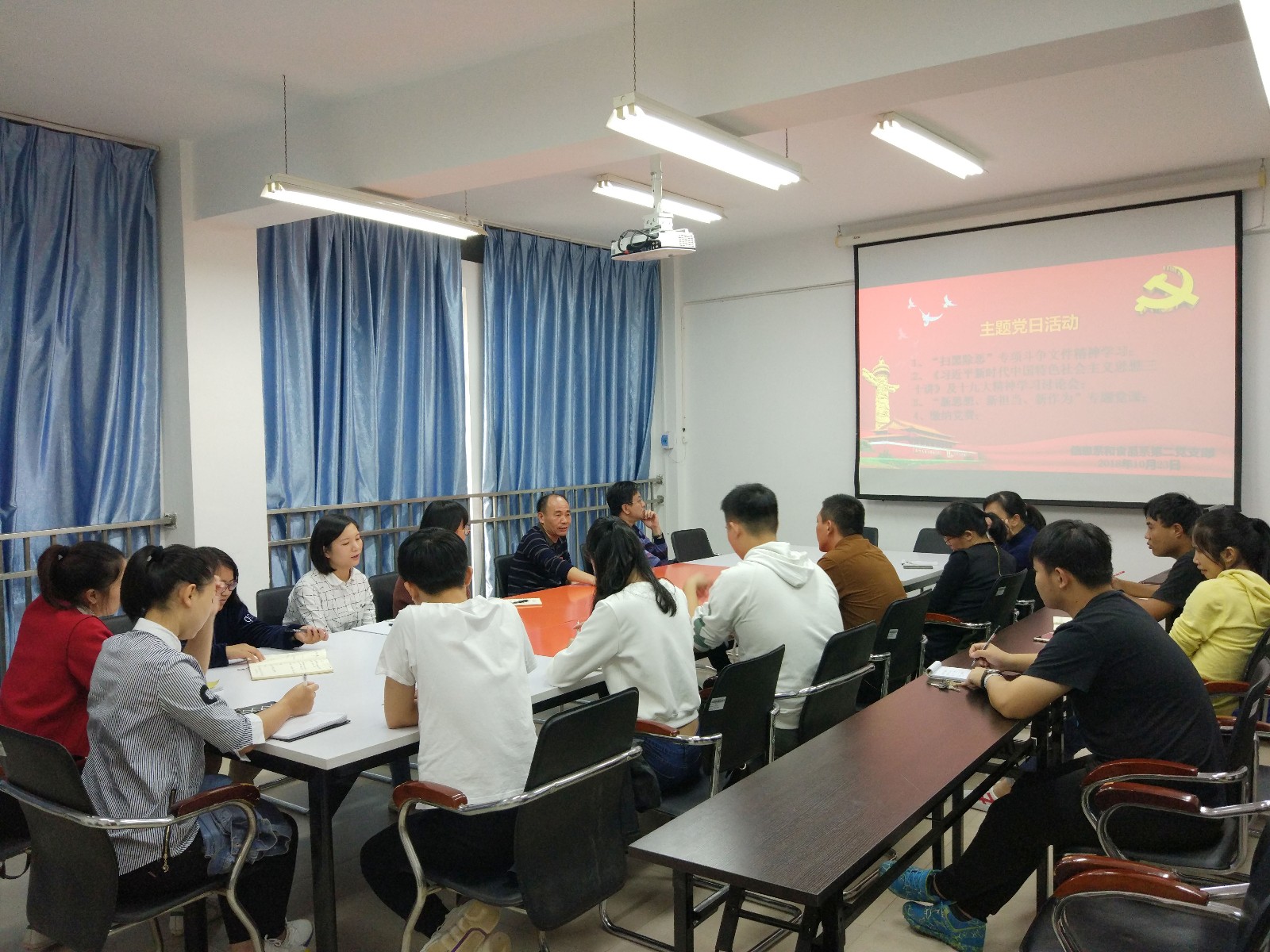 2018年10月23日下午,信息系和食品系第二党支部召开10月主题党日活动。本月党日活动主题是学习习近平新时代中国特色社会主义思想。活动由支部书记胡建辉同志主持,支部教师党员、学生预备党员参加。