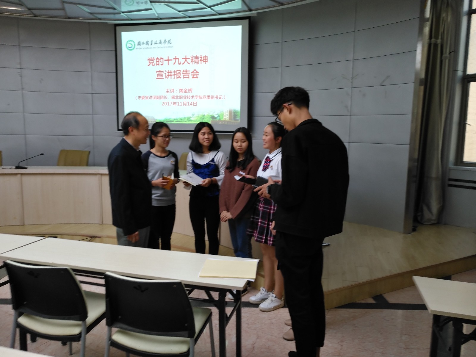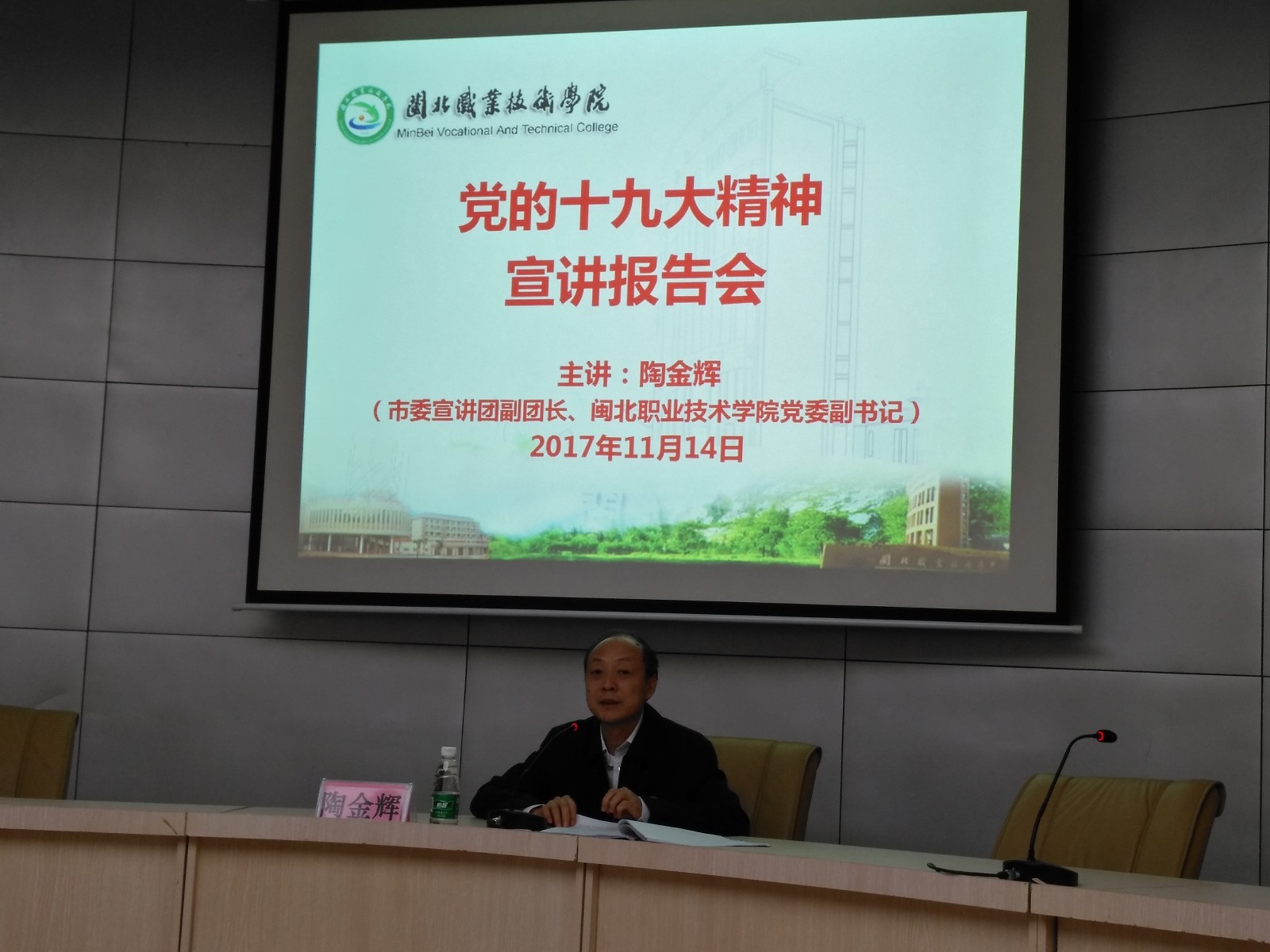 2017年11月14日下午,Beat365党的十九大精神宣讲报告会在行政办公楼一楼报告厅举行,南平市市委宣讲团副团长、院党委副书记陶金辉同志作了宣讲报告,院中层以上党员干部、各总支委员、支部委员、学生代表等70余人参加了报告会,系主任、总支副书记张金良,系常务副书记郑启阶等出席了会议。陶副书记从“关于十九大的主题、成果”、“关于习近平新时代中国特色社会主义思想”等八个方面进行了宣讲。宣讲全面、到位,切合实际,全体与会人员对党的十九大精神有了更深入的认识。报告会结束后,陶副书记现场接受了学生的采访,对学生提出的问题进行了一一解答。