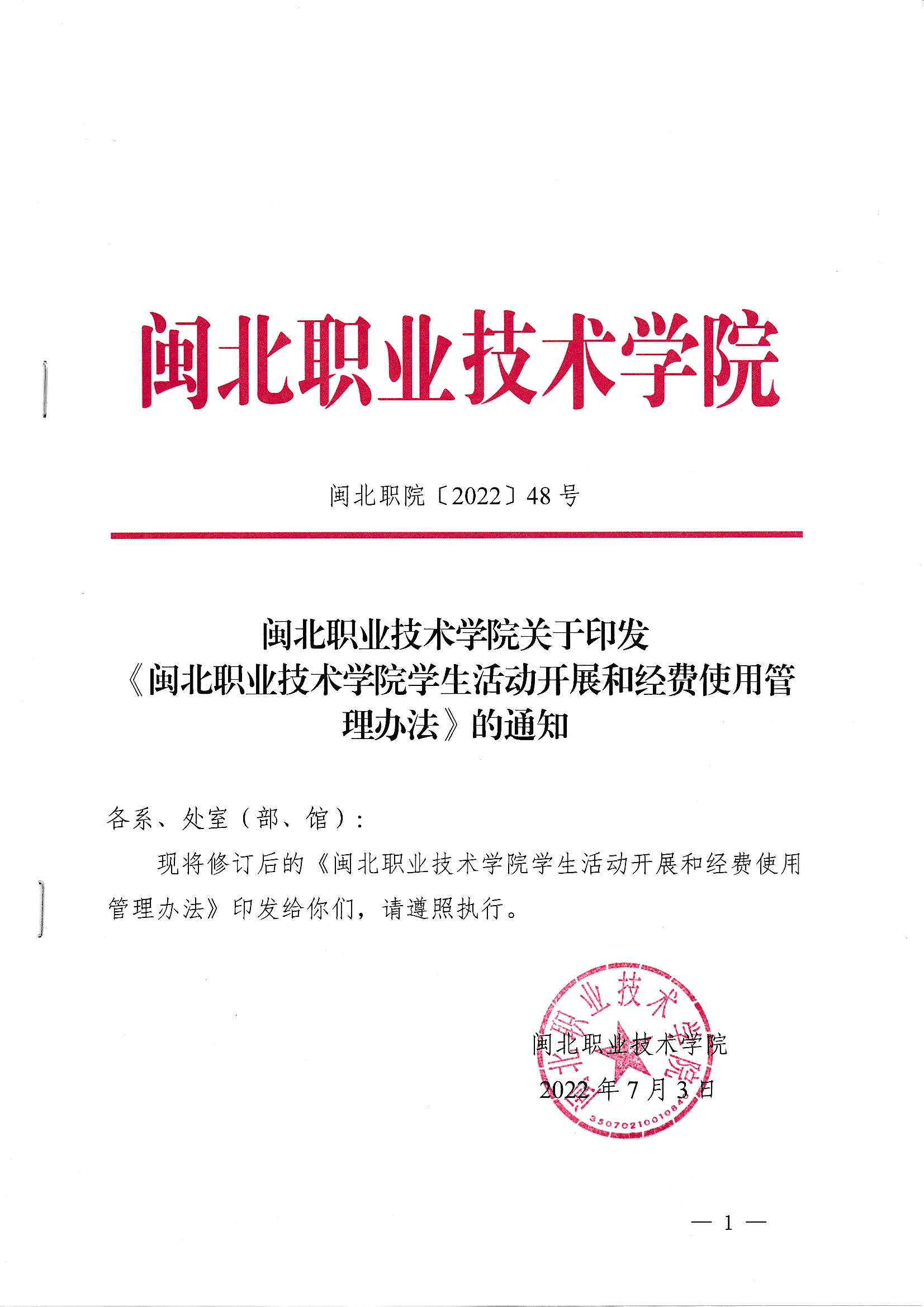 Beat365中文官方网站关于印发《Beat365中文官方网站学生活动开展和经费使用管理办法》的通知(闽北职院〔2022〕48号)