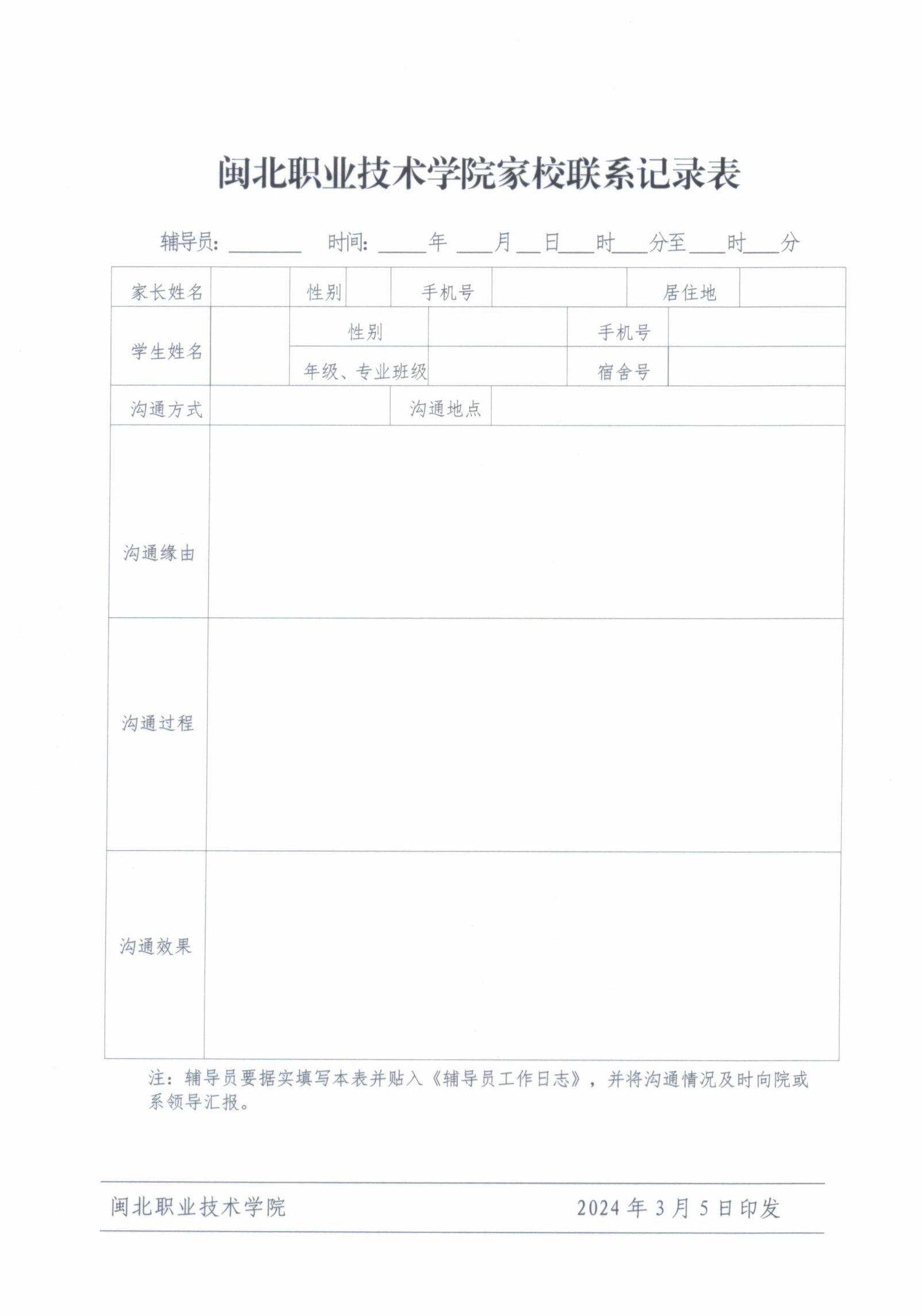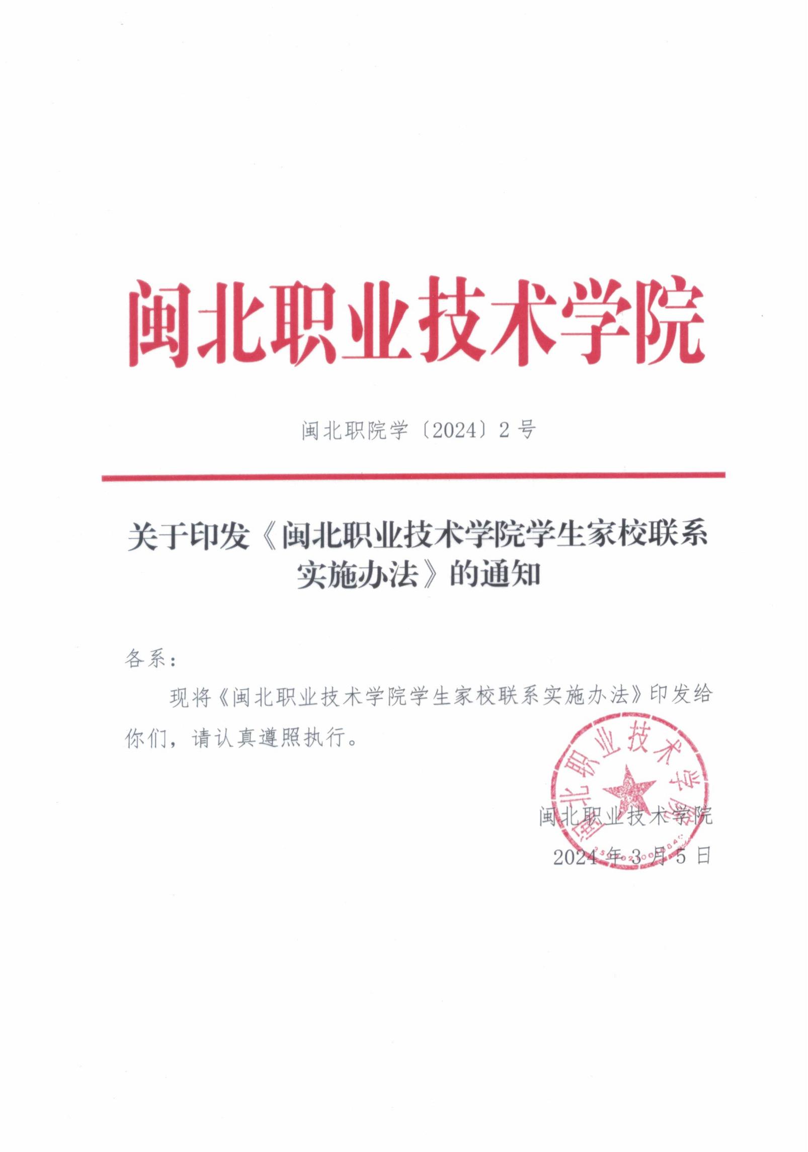 闽北职院学〔2024〕2号 关于印发《Beat365中文官方网站学生家校联系实施办法》的通知