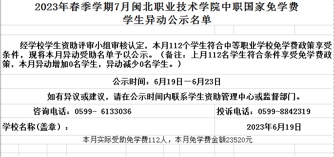 2023年春季学期7月Beat365中文官方网站中职国家免学费 学生异动公示名单