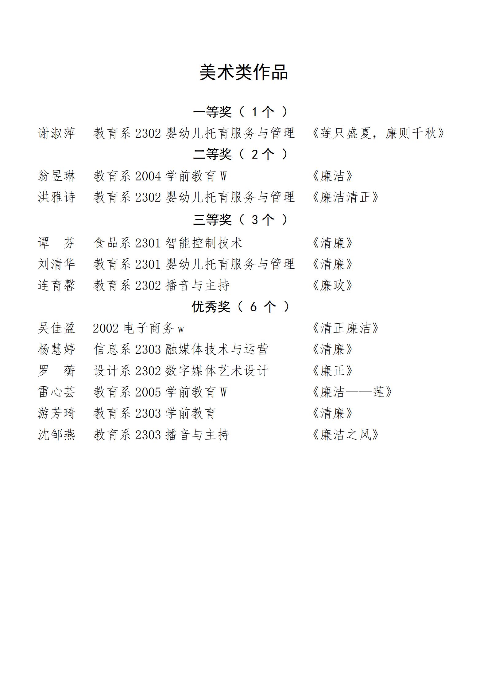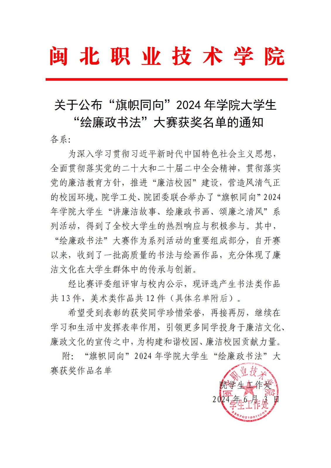 关于公布“旗帜同向”2024年学院大学生“绘廉政书法”大赛获奖名单的通知