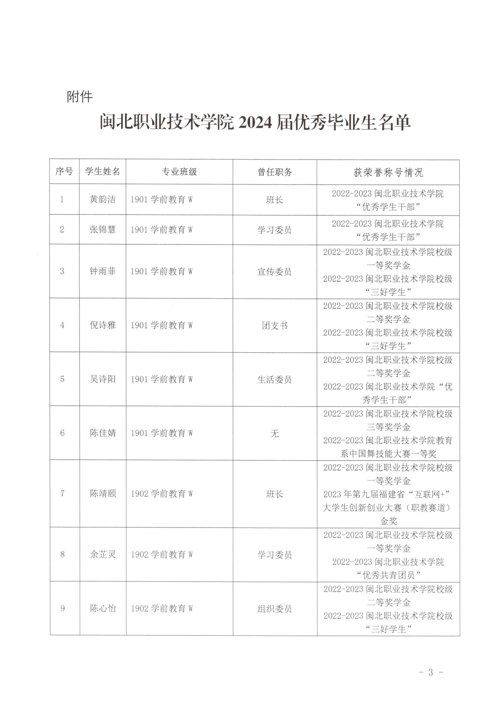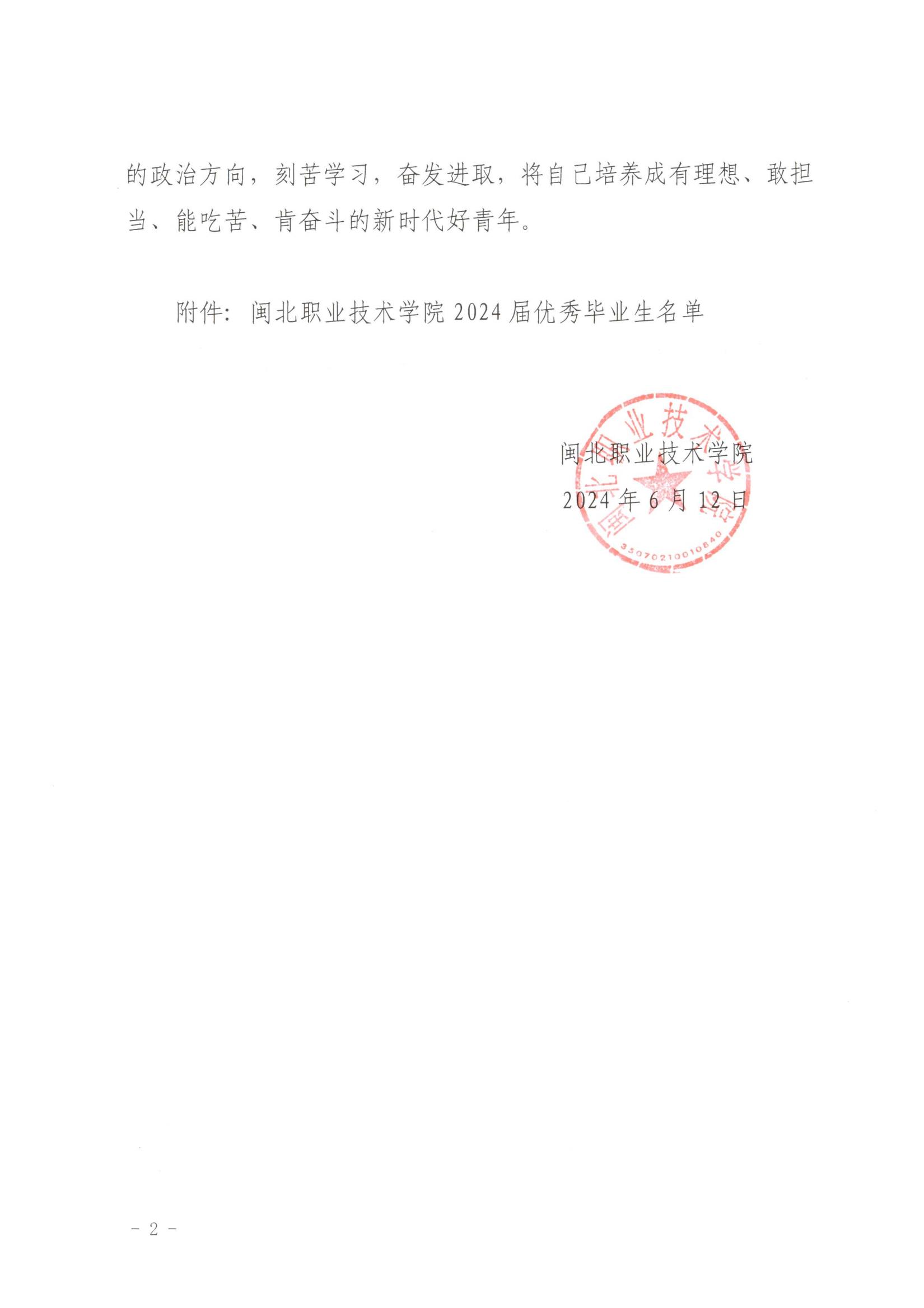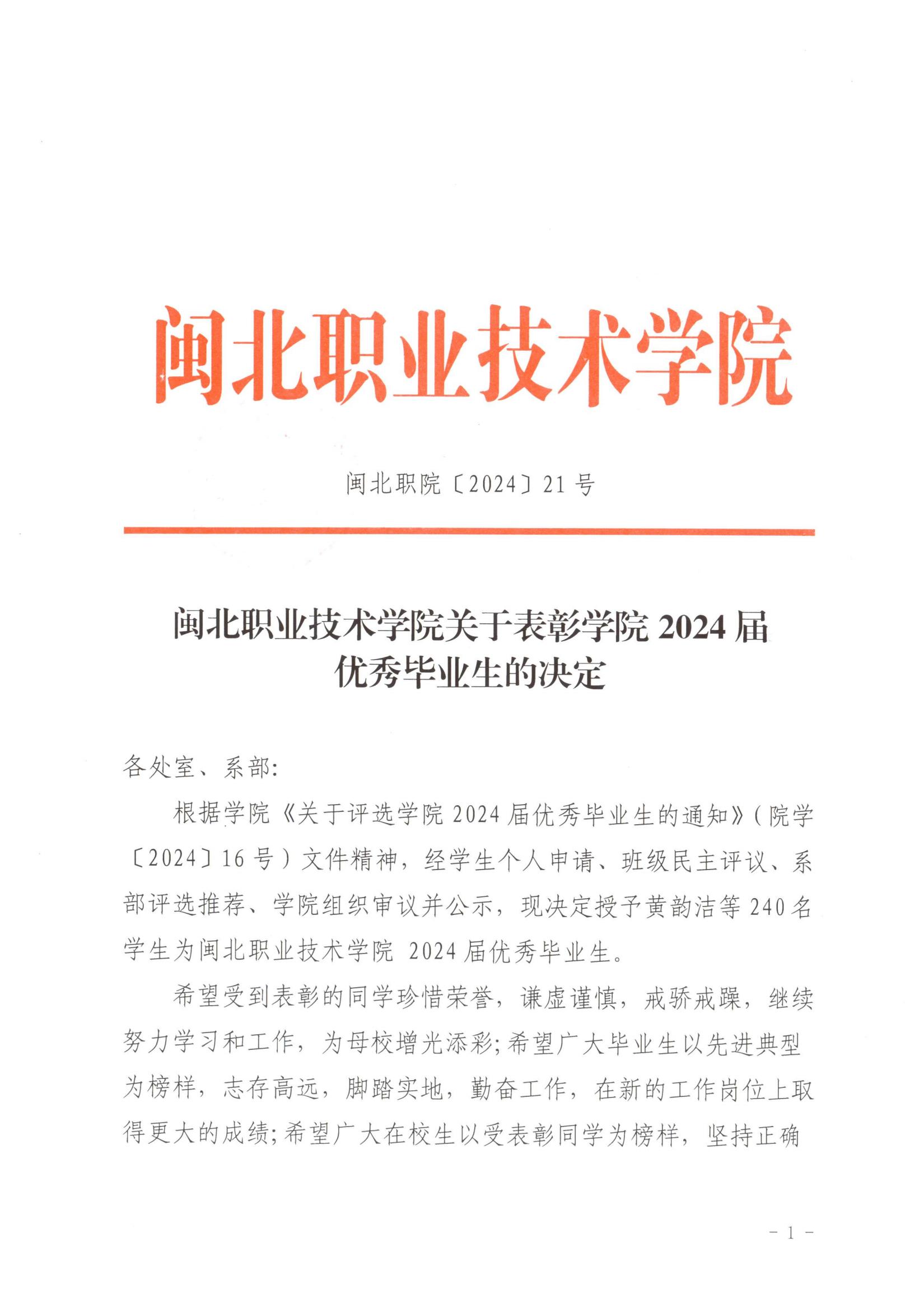 闽北职院〔2024〕21号 Beat365中文官方网站关于授予黄韵洁等240位同学为2024届优秀毕业生的决定