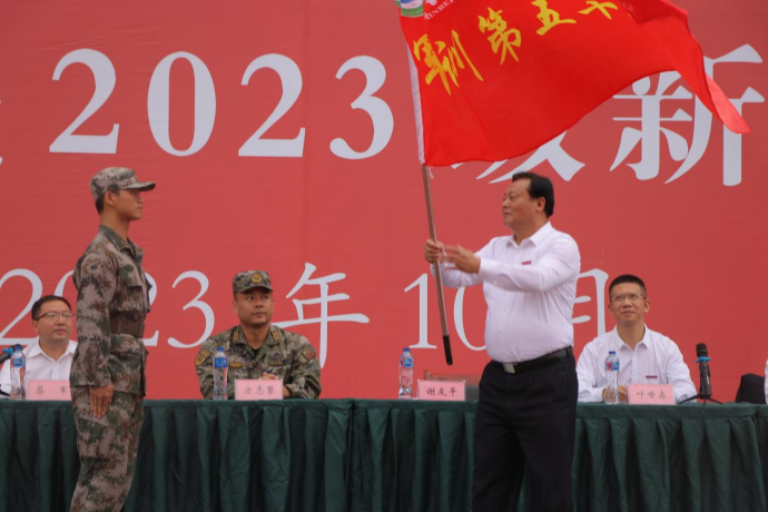 谢友平宣布2023级新生军训开训并为连队代表授旗。