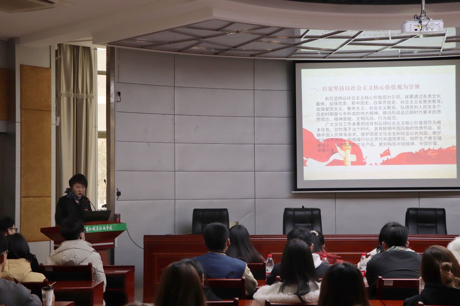 陈婷主任围绕《深入学习贯彻党的十九届五中全会精神——繁荣发展文化事业和文化产业,建成文化强国》主题,从自觉坚持以社会主义核心价值观为引领、始终坚持党的全面领导这个根本保证、牢牢把握推动高质量发展这个根本主题、有效激活改革创新这个根本动力、紧紧扣住满足人民日益增长的美好生活需要这个根本目的五个方面进行了阐述,强调了在2035年建成文化强国的远景目标,希望同学们不忘习总书记的嘱托,努力学习,“共走技能成才之路、共抒技能报国之志”,“裁剪梦想形状、设计职业蓝图”,以青春和热血铸就“文化强国”的光明未来。
