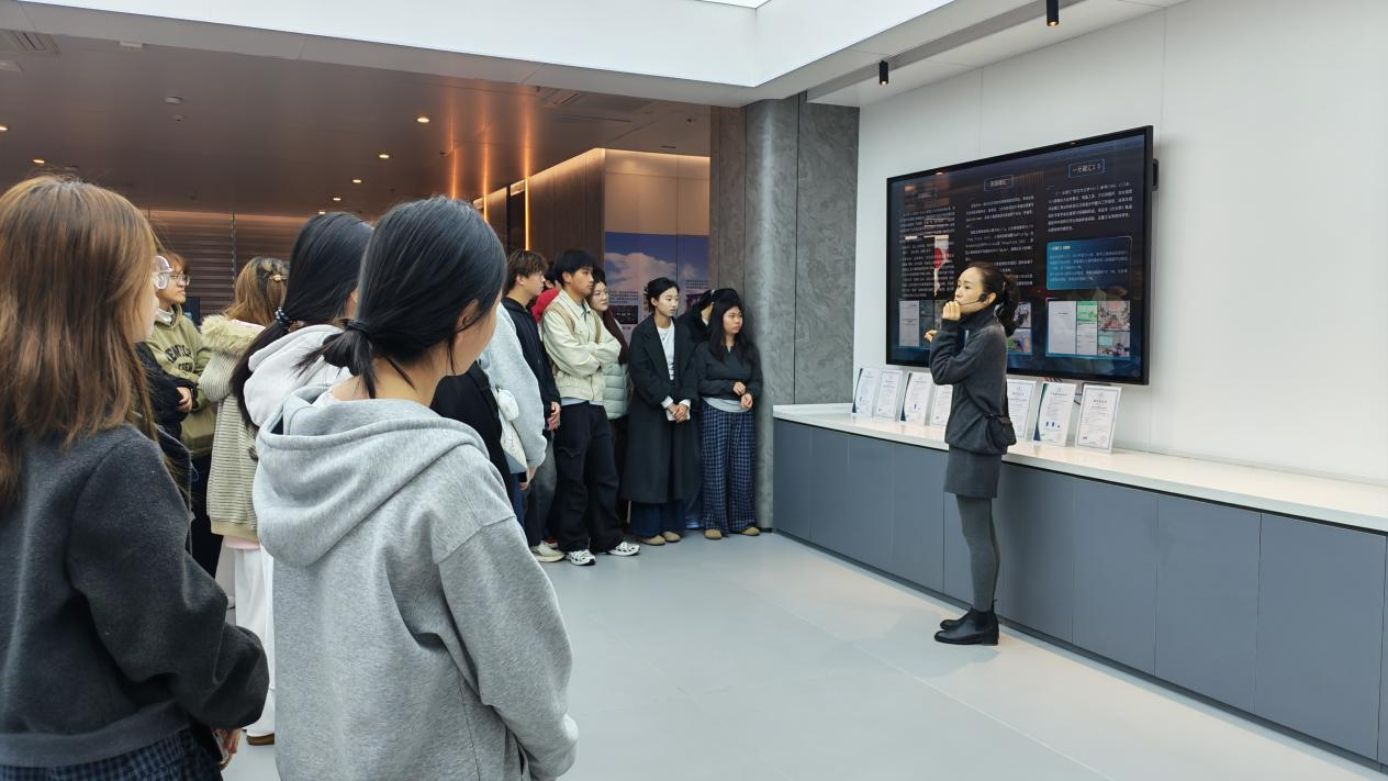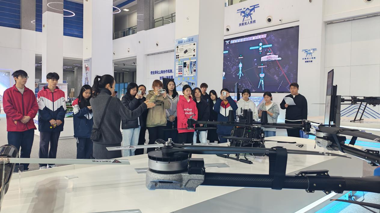在集团碳谷学校负责人罗小琴的带领下,师生一行先后参观了集团国碳展厅与低空展厅。罗小琴从专业视角出发,系统讲解了碳交易机制、碳排放核算标准、碳足迹全流程管理等核心知识,通过实物展示、案例分析等方式,让同学们直观理解低碳科技的产业应用逻辑;同时,她还重点介绍了无人机在低空经济领域的创新应用场景,包括生态监测、文旅航拍、消防维稳等,为同学们呈现了科技赋能绿色发展的生动实践。