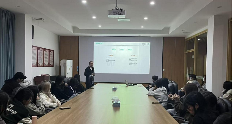 宣讲会上,福建六融工业有限公司的招聘代表人事经理李善斌详细介绍了公司的发展历程、企业文化、核心业务以及未来的发展规划。作为一家深耕服装领域的企业,六融工业着重展示了其在设计、生产与供应链方面的强大实力,让同学们对企业的运营模式和行业地位有了更深入的了解。