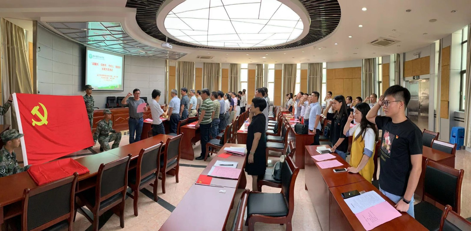 活动在雄壮的的国歌声中拉开了序幕,全体党员在党旗面前,重温入党誓词,铭记党员身份,增强了党员意识;大家怀着无限的深情一起朗诵了伟大的无产阶级革命家、军事家、杰出的农民运动领袖,中国共产党早期领导人之一方志敏烈士的《可爱的中国》。党员们,从字里行间感受到方志敏烈士对祖国那份沉甸甸的爱!党员们齐声高唱《歌唱祖国》,抒发了党员对祖国大好河山的无限热爱,对中国特色社会主义道路的坚定信心!最后,大家一起观看了视频(《我们走在大路上》第一集,新中国诞生。大家深刻认识到新中国的诞生是近代以来无数仁人志士奋斗牺牲的结果,是二十八年来中国共产党领导革命战争取得的结果,更加坚定了共产党员的初心和使命!