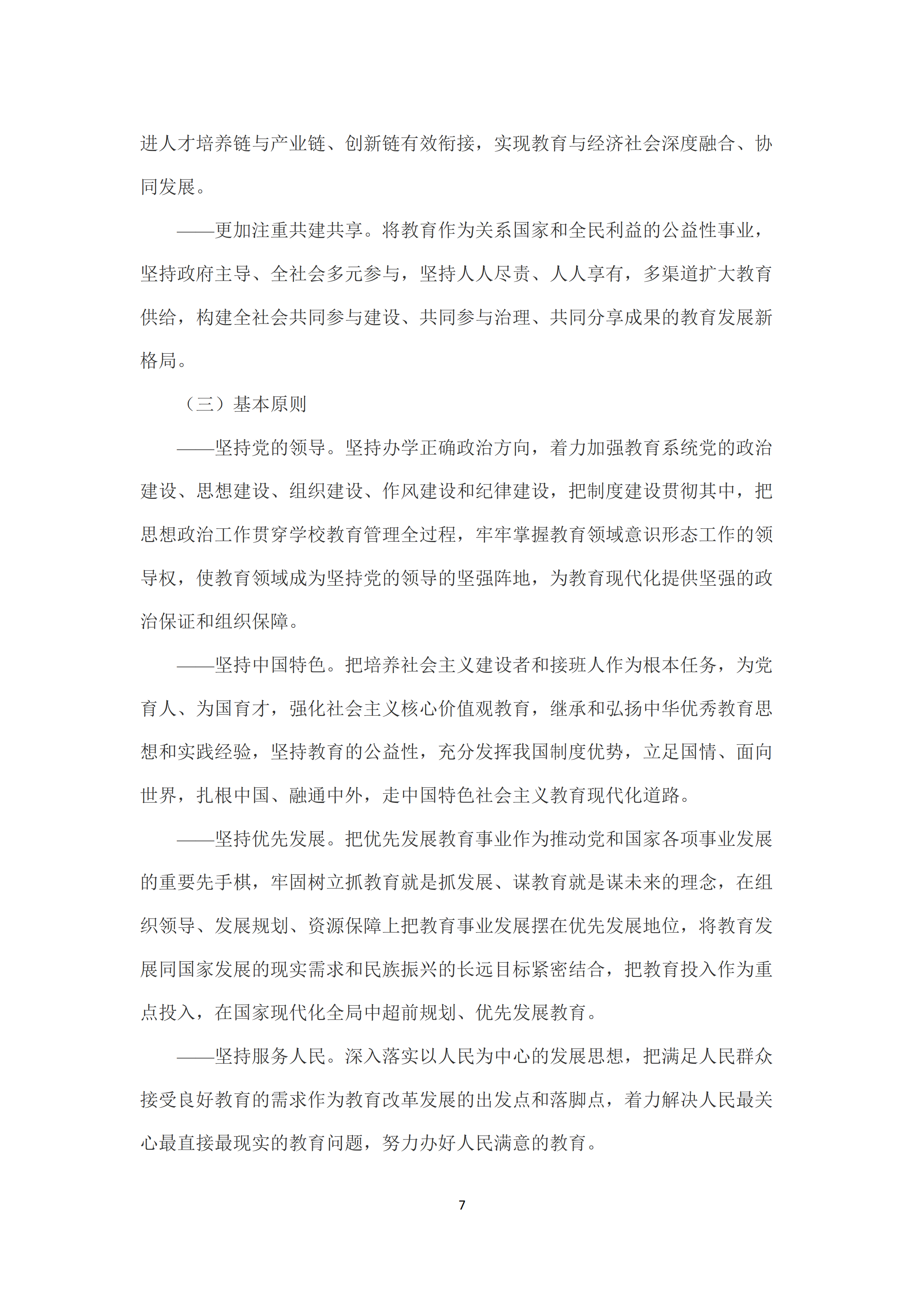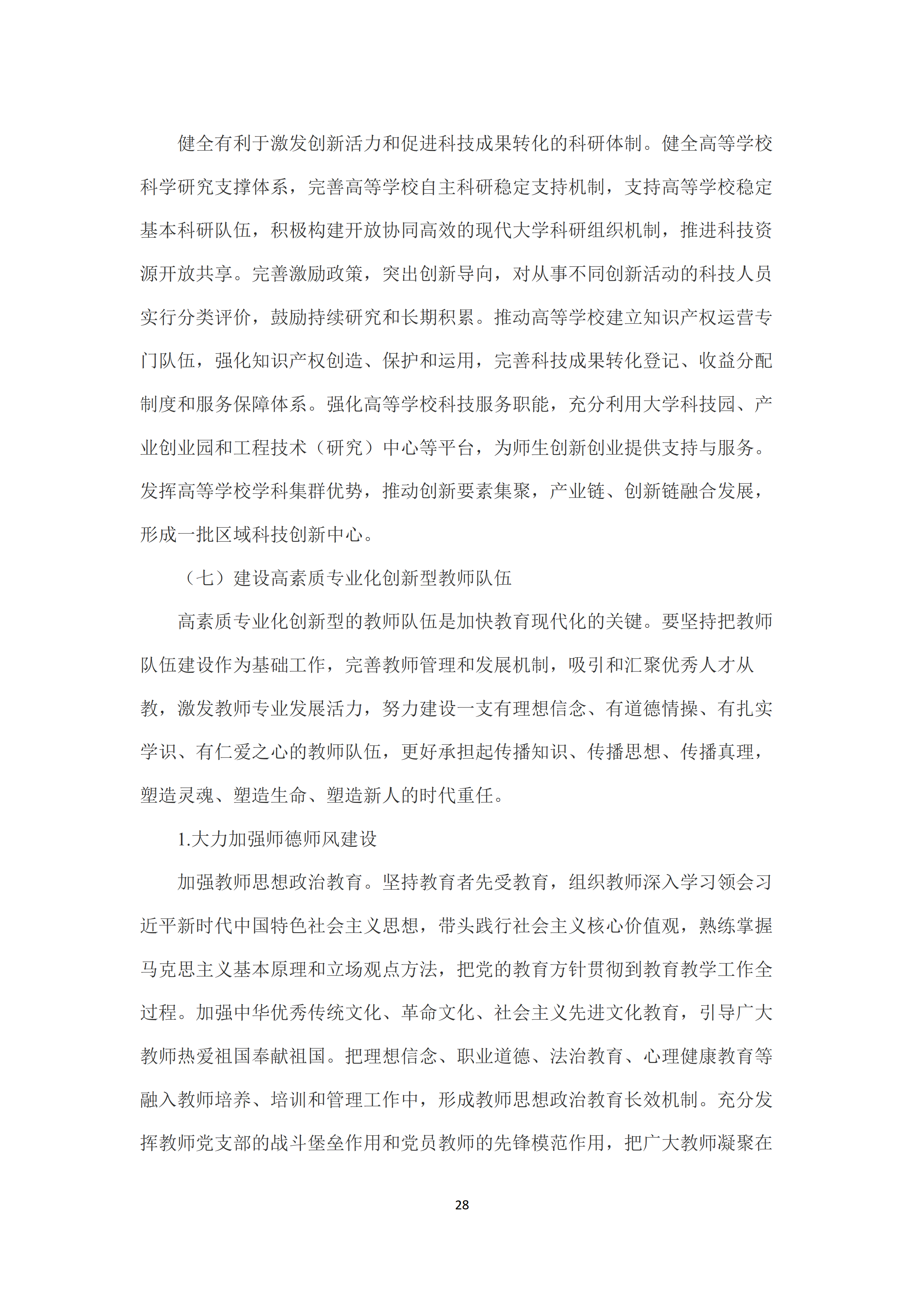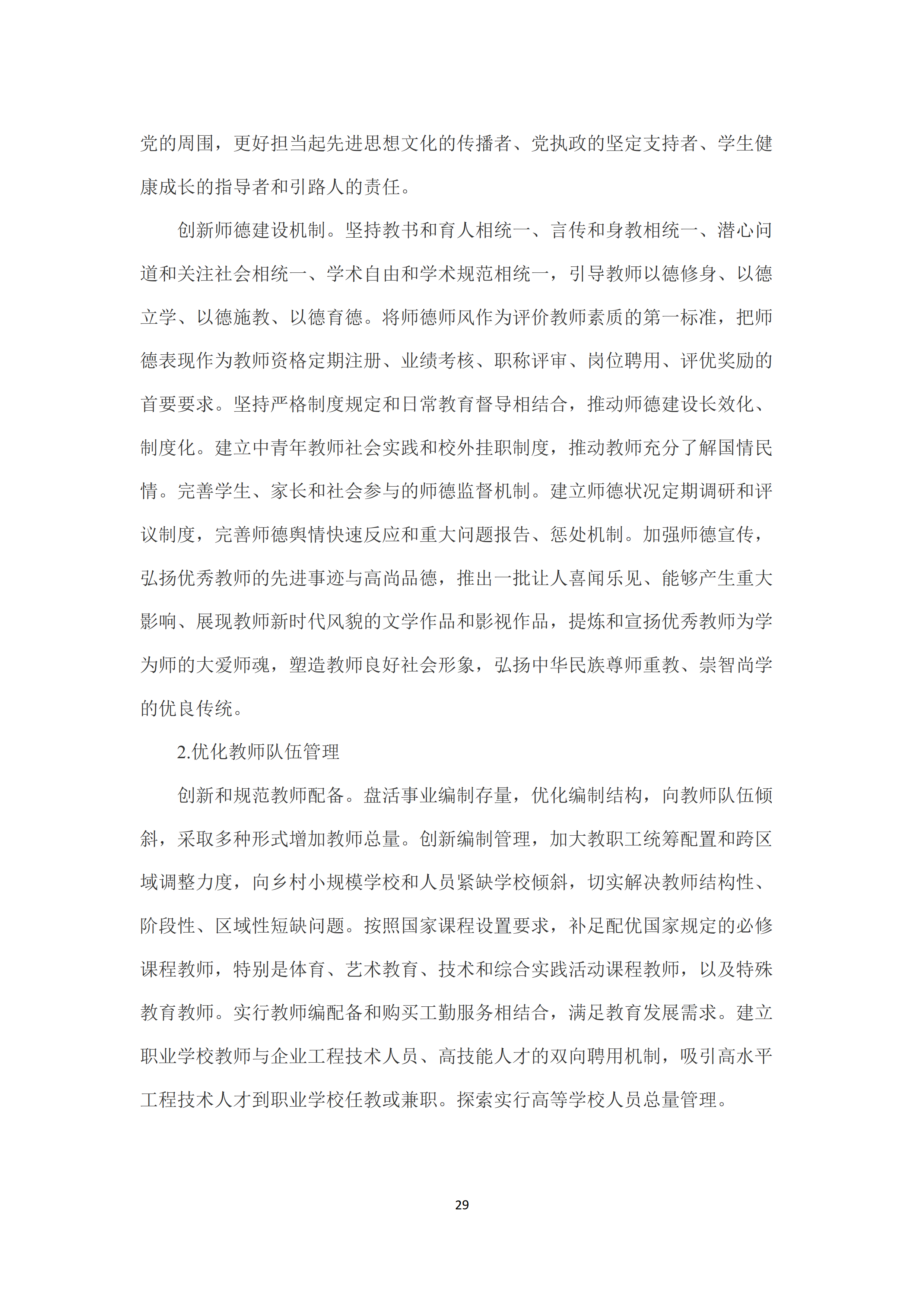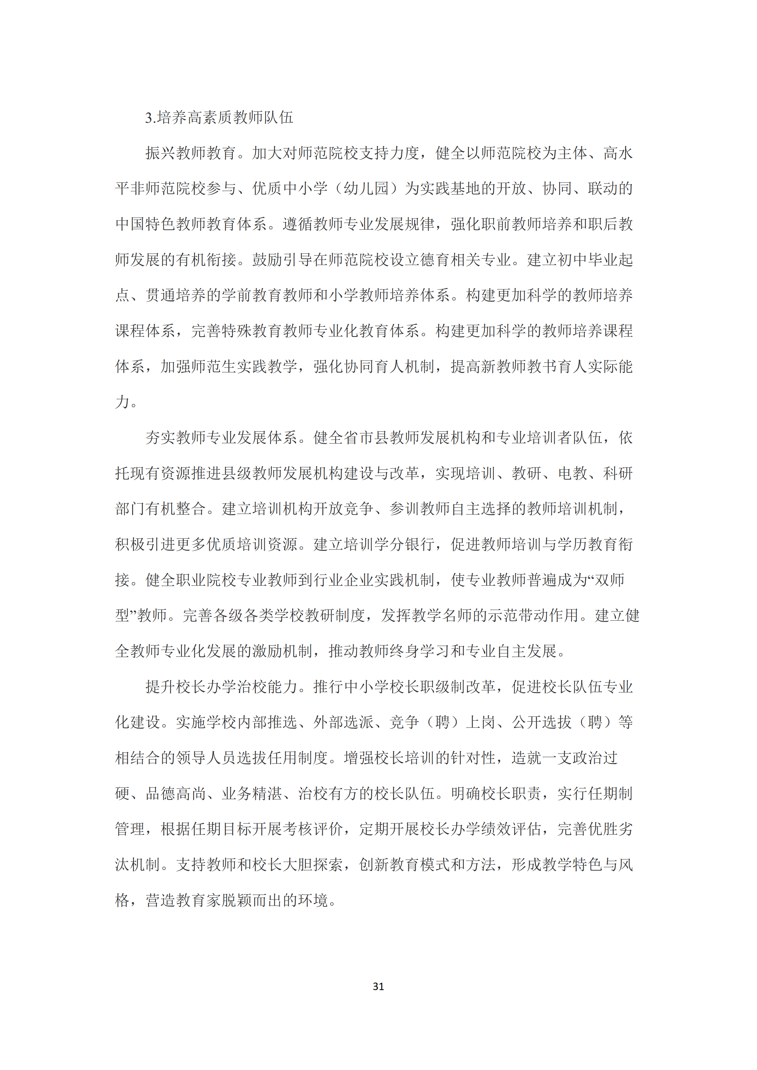 七是建设高素质专业化创新型教师队伍。大力加强师德师风建设,将师德师风作为评价教师素质的第一标准,推动师德建设长效化、制度化。加大教职工统筹配置和跨区域调整力度,切实解决教师结构性、阶段性、区域性短缺问题。完善教师资格体系和准入制度。健全教师职称、岗位和考核评价制度。培养高素质教师队伍,健全以师范院校为主体、高水平非师范院校参与、优质中小学(幼儿园)为实践基地的开放、协同、联动的中国特色教师教育体系。强化职前教师培养和职后教师发展的有机衔接。夯实教师专业发展体系,推动教师终身学习和专业自主发展。提高教师社会地位,完善教师待遇保障制度,健全中小学教师工资长效联动机制,全面落实集中连片特困地区生活补助政策。加大教师表彰力度,努力提高教师政治地位、社会地位、职业地位。