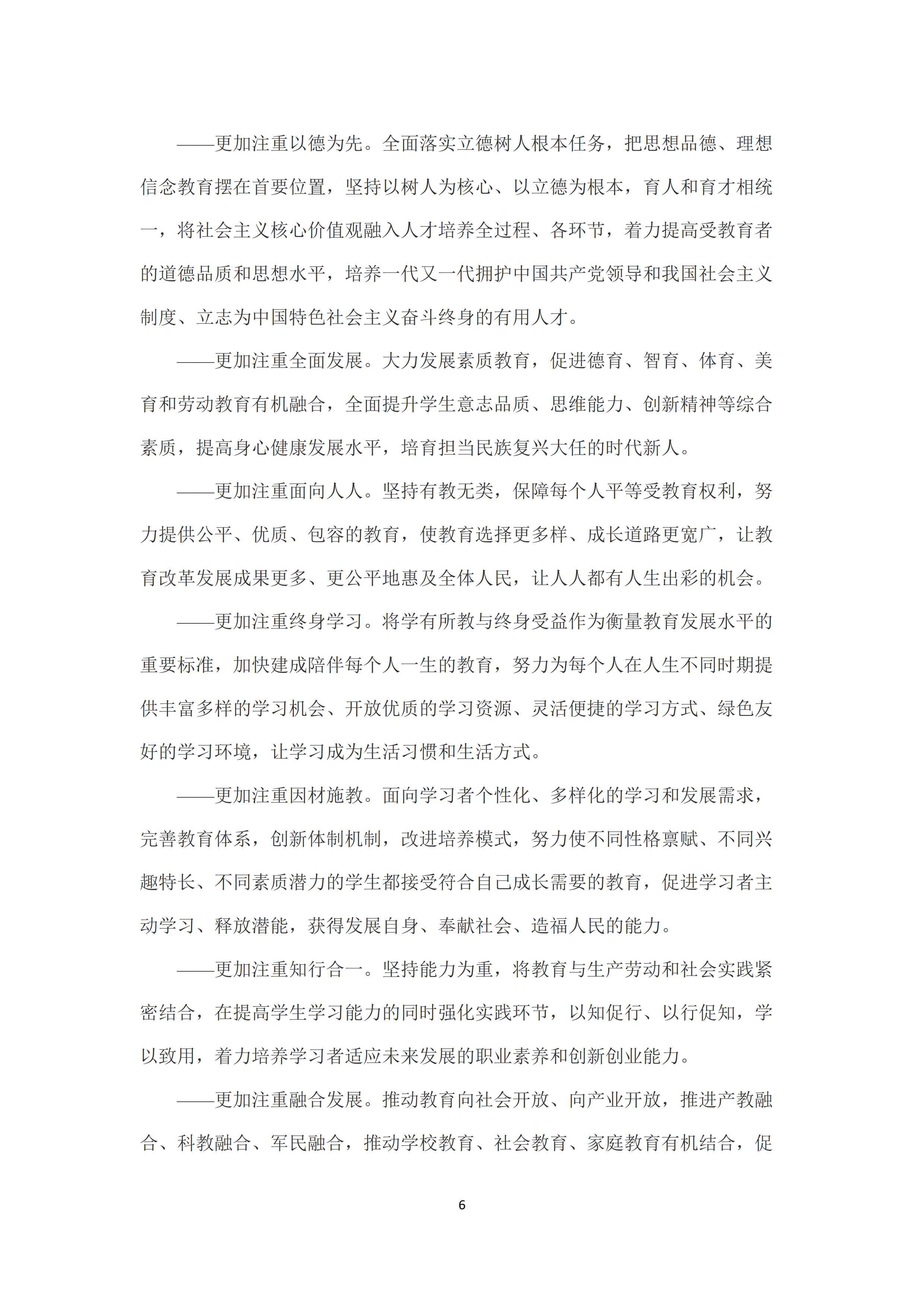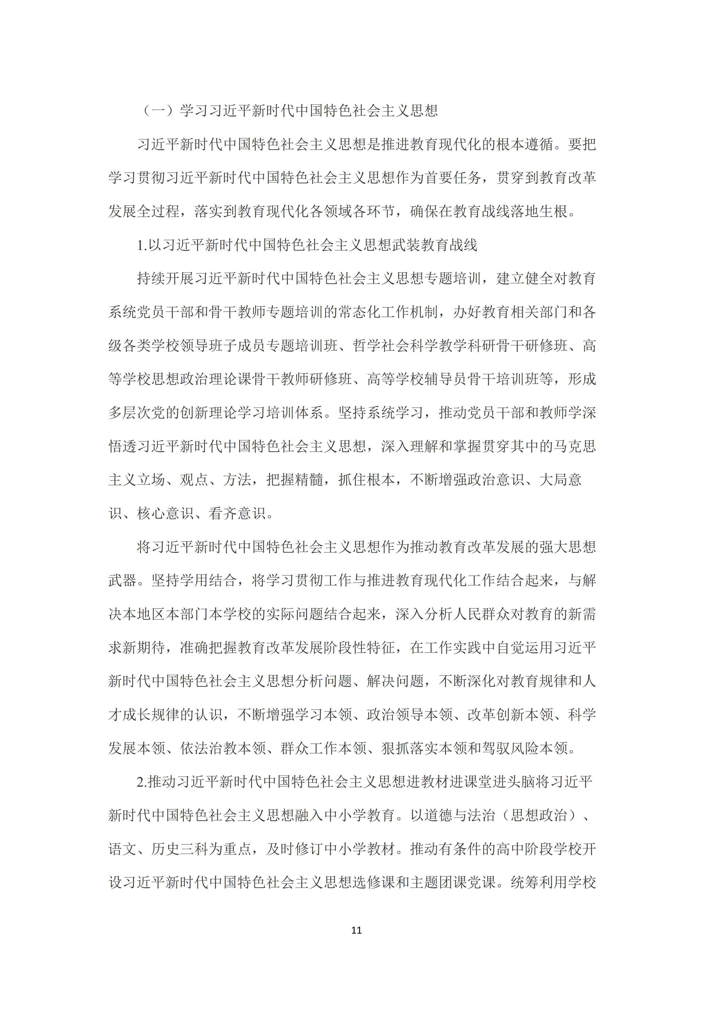 一是学习习近平新时代中国特色社会主义思想。把学习贯彻习近平新时代中国特色社会主义思想作为首要任务,贯穿到教育改革发展全过程,落实到教育现代化各领域各环节。以习近平新时代中国特色社会主义思想武装教育战线,推动习近平新时代中国特色社会主义思想进教材进课堂进头脑,将习近平新时代中国特色社会主义思想融入中小学教育,加强高等学校思想政治教育。加强习近平新时代中国特色社会主义思想系统化、学理化、学科化研究阐释,健全习近平新时代中国特色社会主义思想研究成果传播机制。