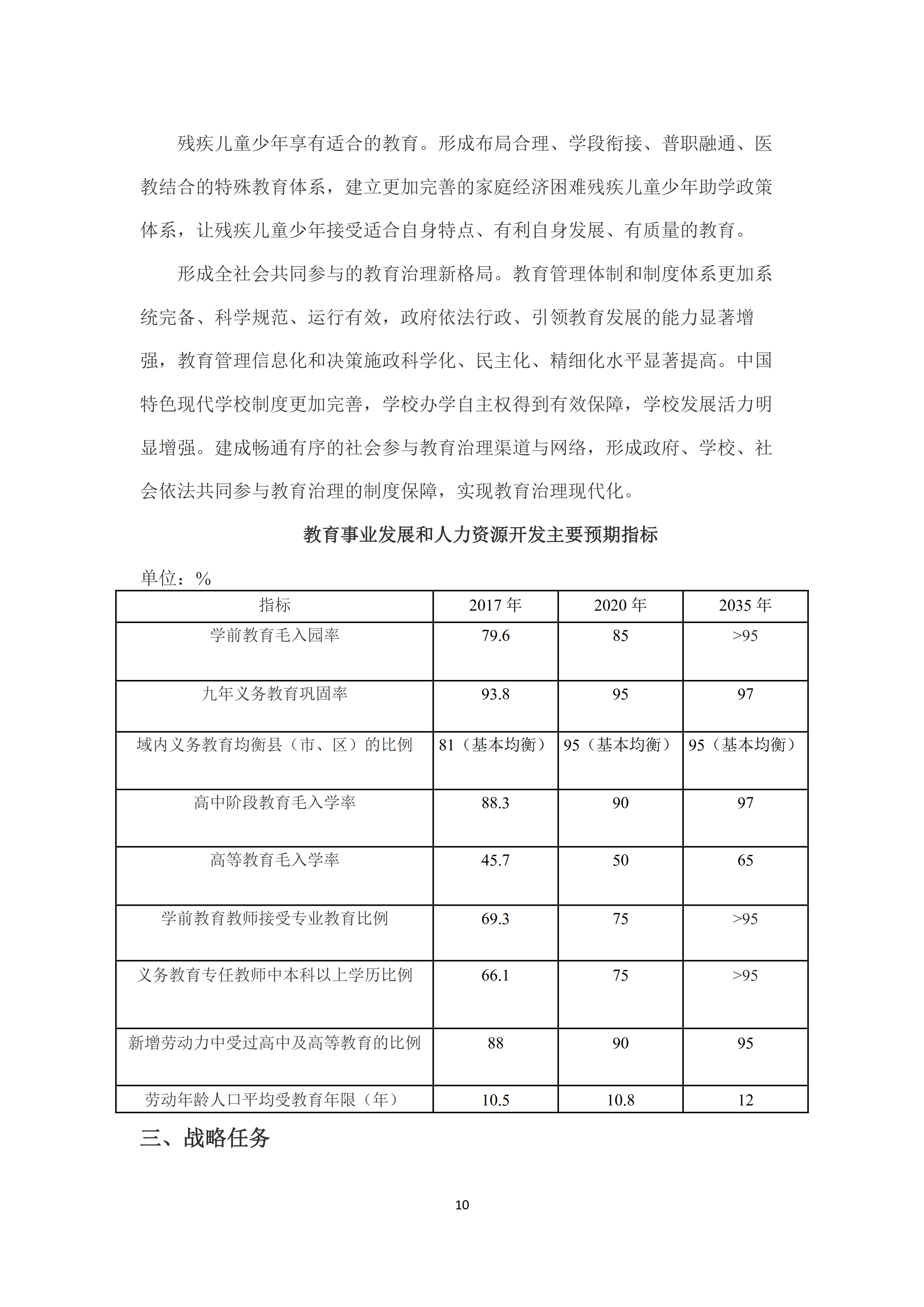 《中国教育现代化2035》提出,推进教育现代化的总体目标是:到2020年,全面实现“十三五”发展目标,教育总体实力和国际影响力显著增强,劳动年龄人口平均受教育年限明显增加,教育现代化取得重要进展,为全面建成小康社会作出重要贡献。在此基础上,再经过15年努力,到2035年,总体实现教育现代化,迈入教育强国行列,推动我国成为学习大国、人力资源强国和人才强国,为到本世纪中叶建成富强民主文明和谐美丽的社会主义现代化强国奠定坚实基础。2035年主要发展目标是:建成服务全民终身学习的现代教育体系、普及有质量的学前教育、实现优质均衡的义务教育、全面普及高中阶段教育、职业教育服务能力显著提升、高等教育竞争力明显提升、残疾儿童少年享有适合的教育、形成全社会共同参与的教育治理新格局。