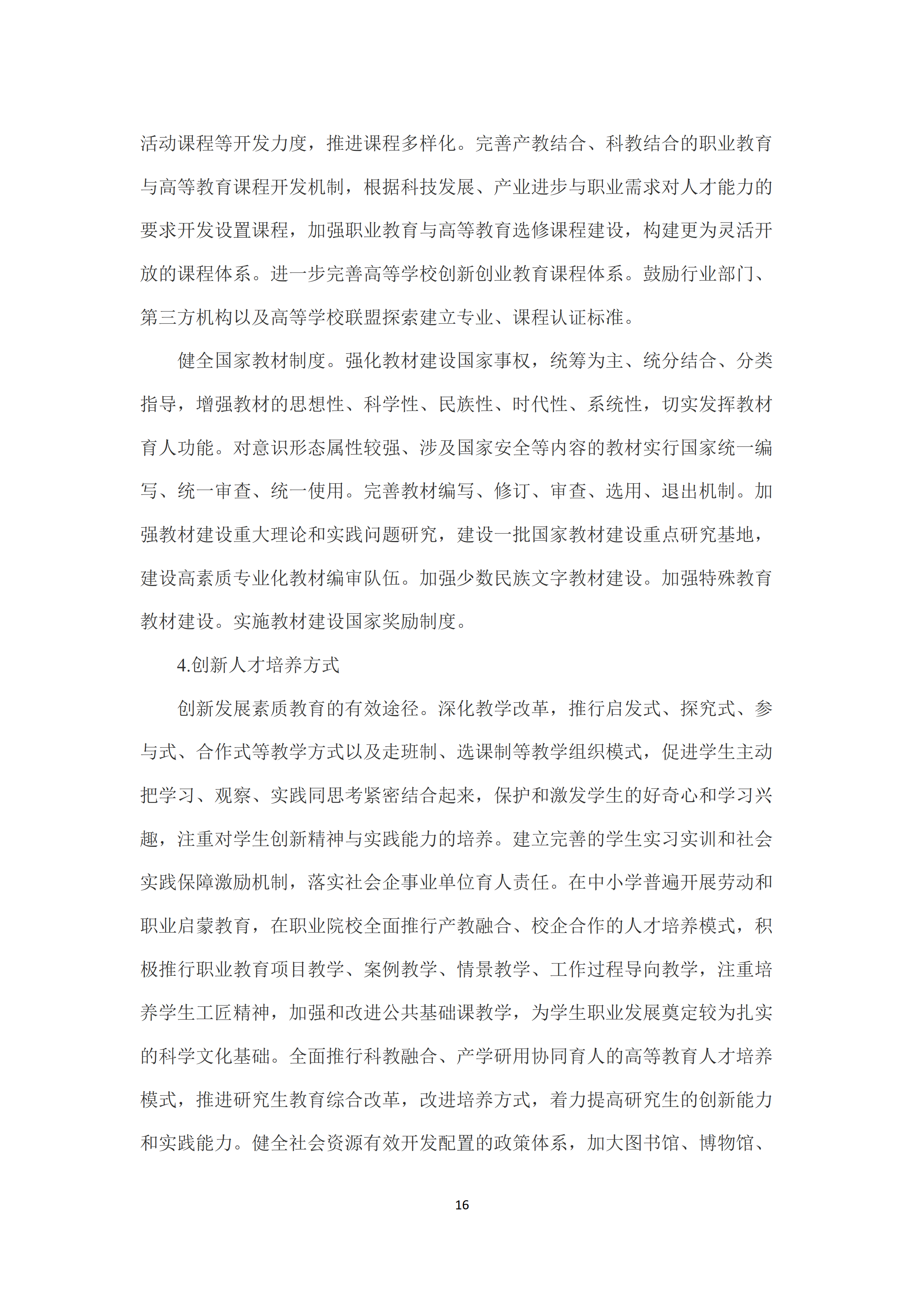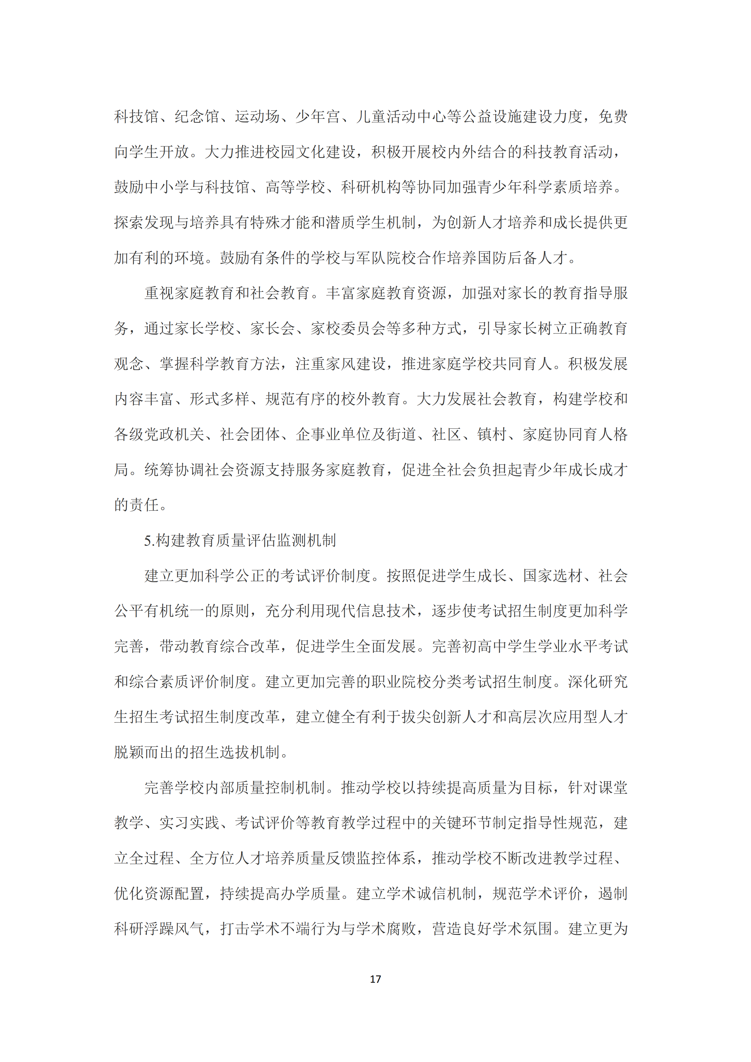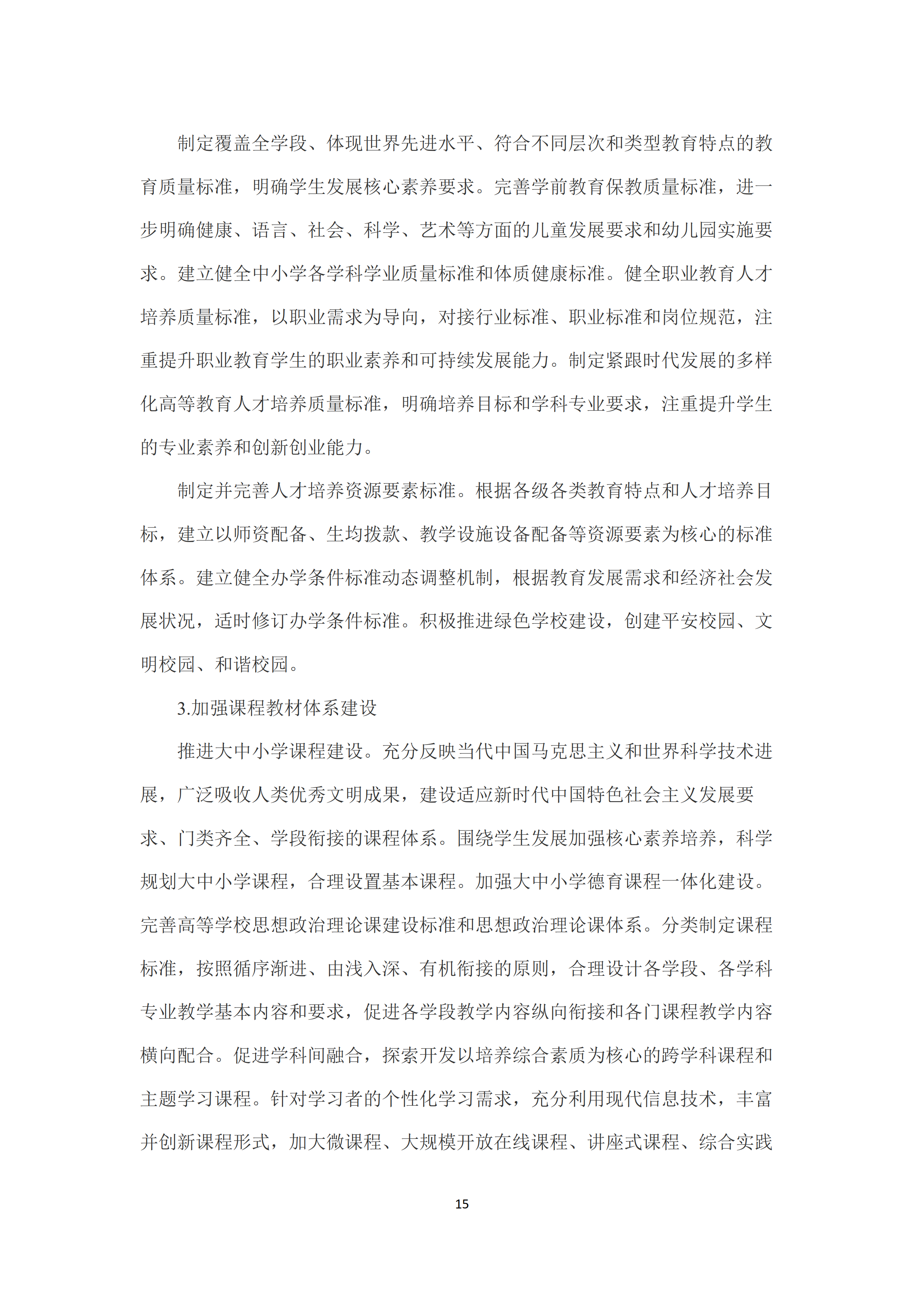二是发展中国特色世界先进水平的优质教育。全面落实立德树人根本任务,广泛开展理想信念教育,厚植爱国主义情怀,加强品德修养,增长知识见识,培养奋斗精神,不断提高学生思想水平、政治觉悟、道德品质、文化素养。增强综合素质,树立健康第一的教育理念,全面强化学校体育工作,全面加强和改进学校美育,弘扬劳动精神,强化实践动手能力、合作能力、创新能力的培养。完善教育质量标准体系,制定覆盖全学段、体现世界先进水平、符合不同层次类型教育特点的教育质量标准,明确学生发展核心素养要求。完善学前教育保教质量标准。建立健全中小学各学科学业质量标准和体质健康标准。健全职业教育人才培养质量标准,制定紧跟时代发展的多样化高等教育人才培养质量标准。建立以师资配备、生均拨款、教学设施设备等资源要素为核心的标准体系和办学条件标准动态调整机制。加强课程教材体系建设,科学规划大中小学课程,分类制定课程标准,充分利用现代信息技术,丰富并创新课程形式。健全国家教材制度,统筹为主、统分结合、分类指导,增强教材的思想性、科学性、民族性、时代性、系统性,完善教材编写、修订、审查、选用、退出机制。创新人才培养方式,推行启发式、探究式、参与式、合作式等教学方式以及走班制、选课制等教学组织模式,培养学生创新精神与实践能力。大力推进校园文化建设。重视家庭教育和社会教育。构建教育质量评估监测机制,建立更加科学公正的考试评价制度,建立全过程、全方位人才培养质量反馈监控体系。