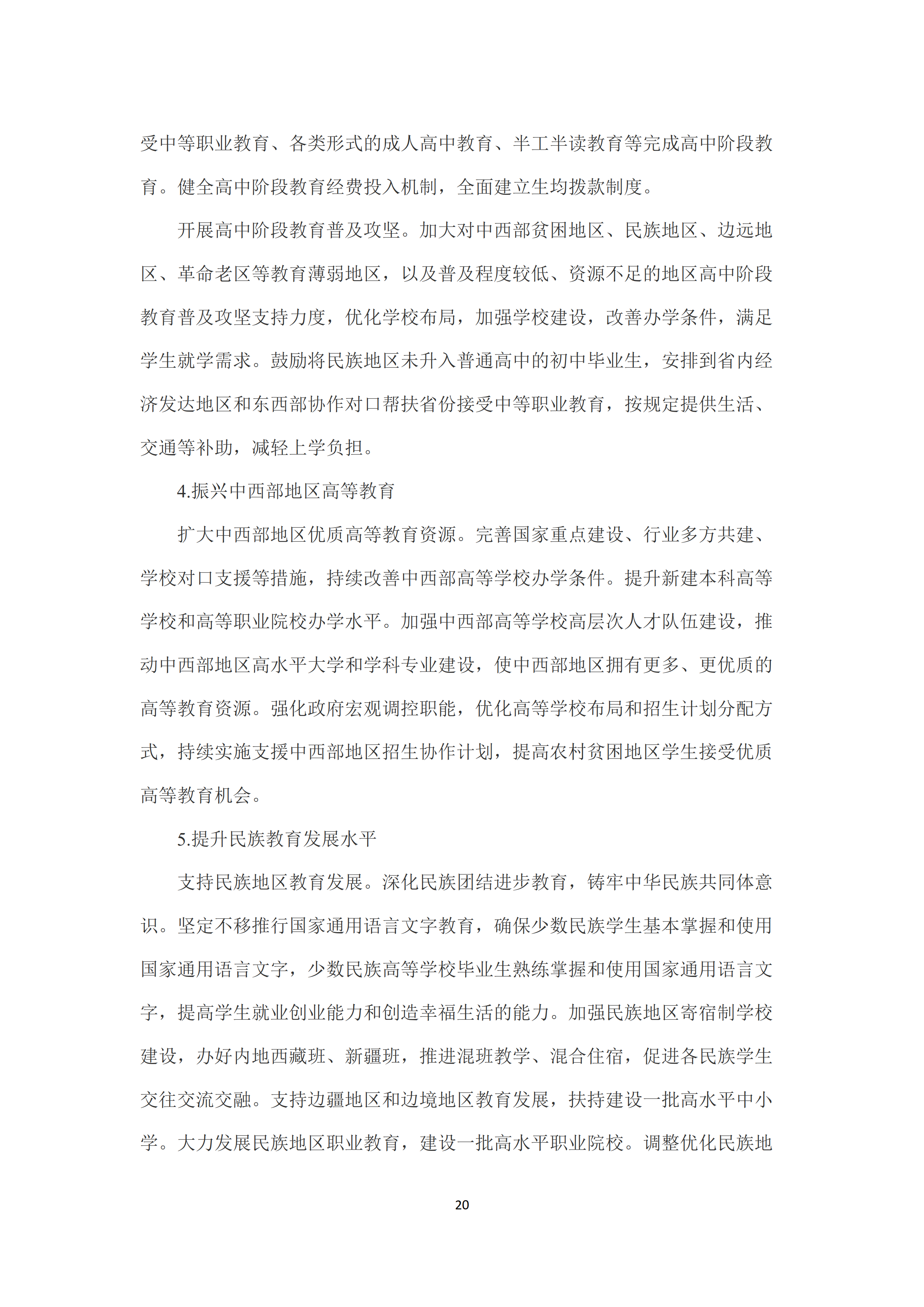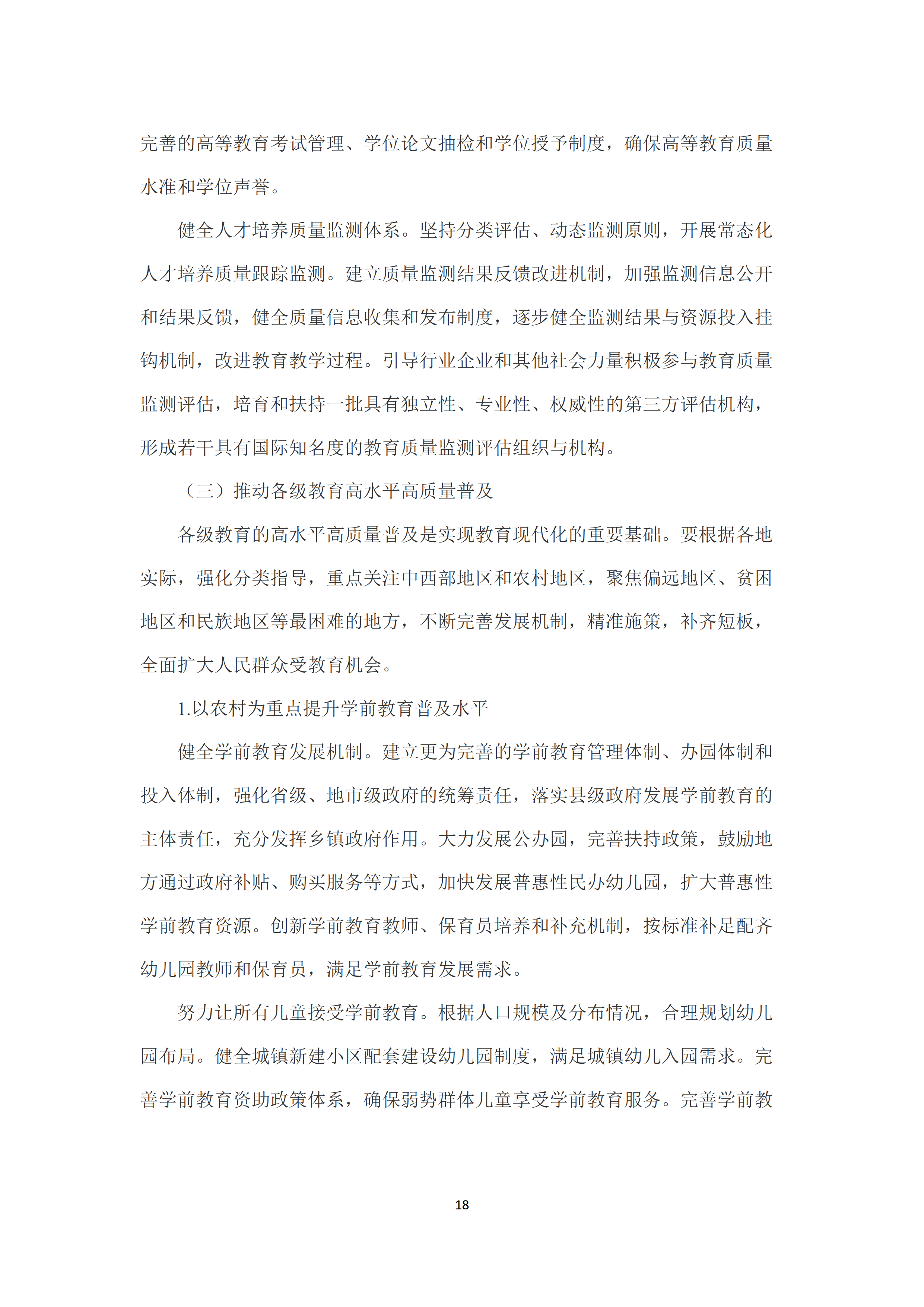 三是推动各级教育高水平高质量普及。以农村为重点提升学前教育普及水平,建立更为完善的学前教育管理体制、办园体制和投入体制,大力发展公办园,加快发展普惠性民办幼儿园。提升义务教育巩固水平,健全控辍保学工作责任体系。提升高中阶段教育普及水平,推进中等职业教育和普通高中教育协调发展,鼓励普通高中多样化有特色发展。振兴中西部地区高等教育。提升民族教育发展水平。