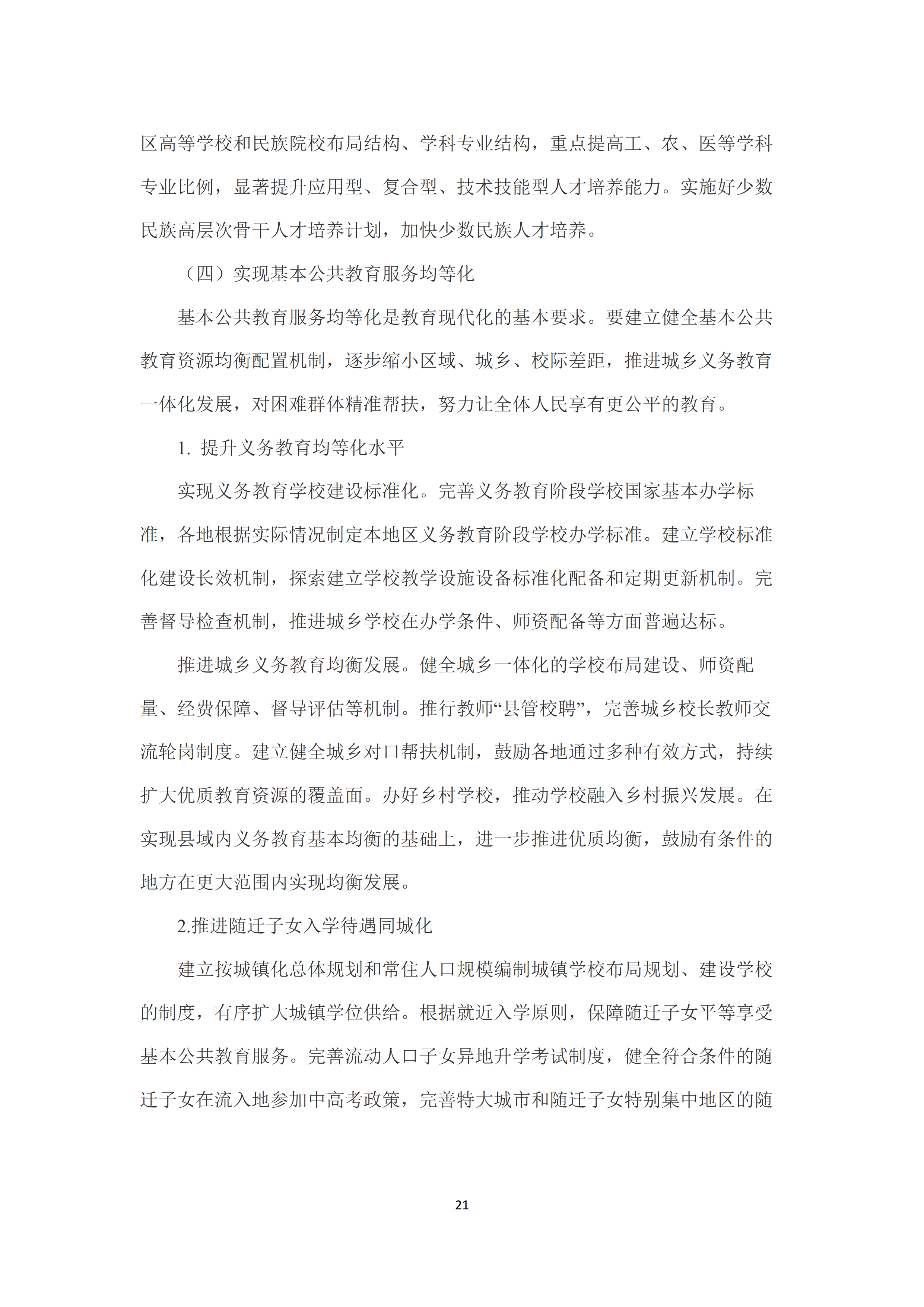 四是实现基本公共教育服务均等化。提升义务教育均等化水平,建立学校标准化建设长效机制,推进城乡义务教育均衡发展。在实现县域内义务教育基本均衡基础上,进一步推进优质均衡。推进随迁子女入学待遇同城化,有序扩大城镇学位供给。完善流动人口子女异地升学考试制度。实现困难群体帮扶精准化,健全家庭经济困难学生资助体系,推进教育精准脱贫。办好特殊教育,推进适龄残疾儿童少年教育全覆盖,全面推进融合教育,促进医教结合。