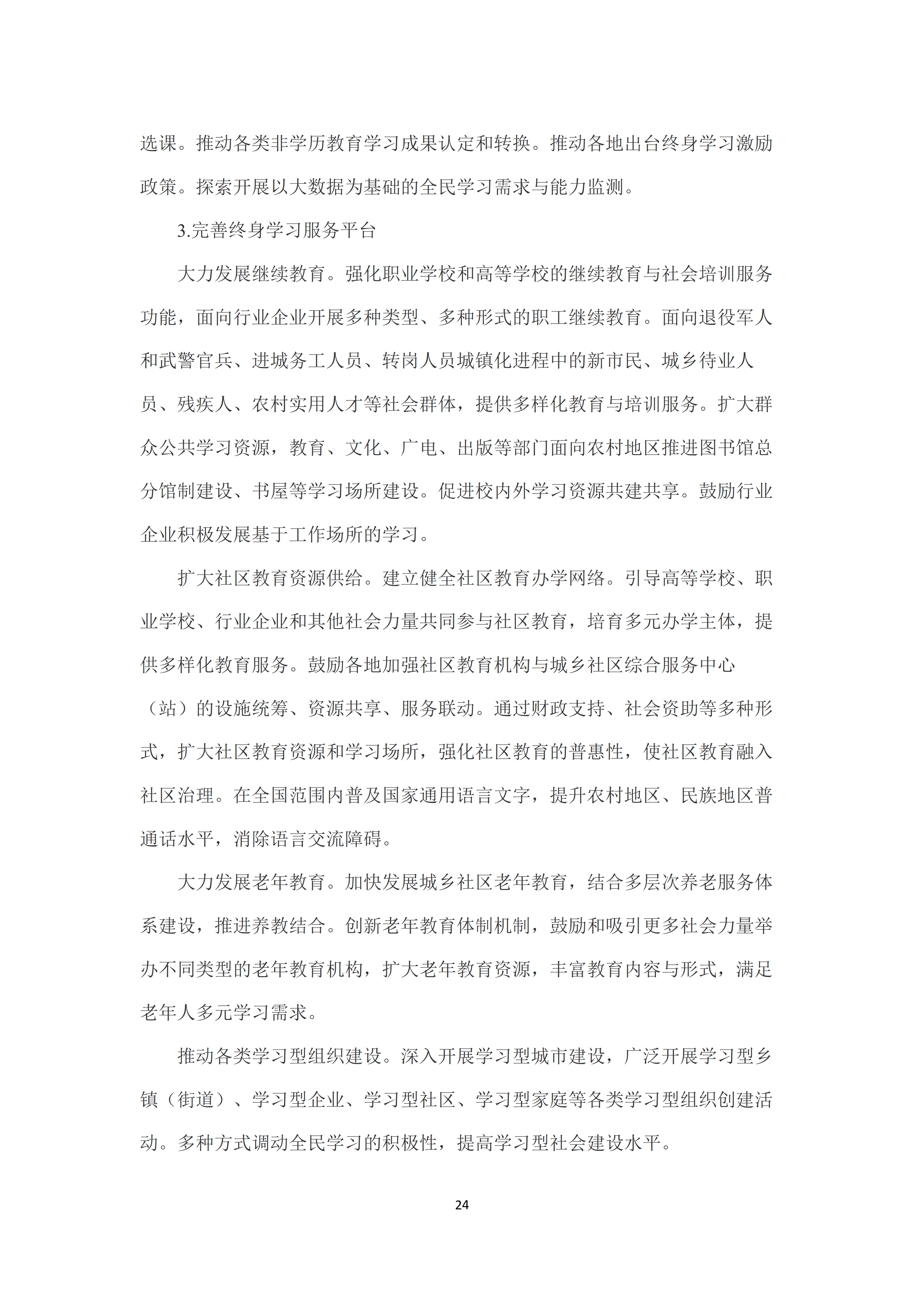 五是构建服务全民的终身学习体系。构建更加开放畅通的人才成长通道,完善招生入学、弹性学习及继续教育制度,畅通转换渠道。建立全民终身学习的制度环境,建立国家资历框架,建立跨部门跨行业的工作机制和专业化支持体系。建立健全国家学分银行制度和学习成果认证制度。强化职业学校和高等学校的继续教育与社会培训服务功能,开展多类型多形式的职工继续教育。扩大社区教育资源供给,加快发展城乡社区老年教育,推动各类学习型组织建设。