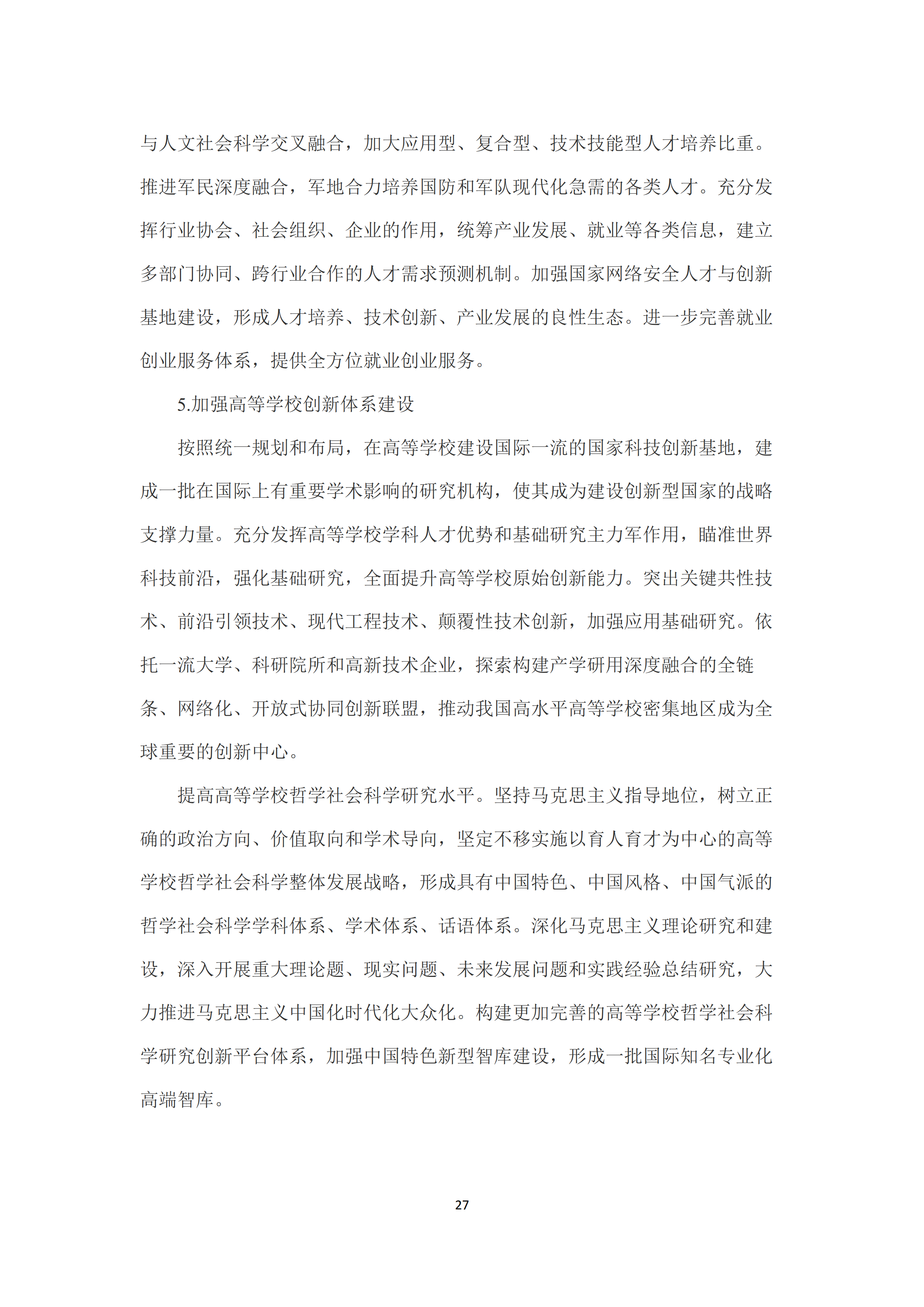 六是提升一流人才培养与创新能力。分类建设一批世界一流高等学校,建立完善的高等学校分类发展政策体系,引导高等学校科学定位、特色发展。持续推动地方本科高等学校转型发展。加快发展现代职业教育,不断优化职业教育结构与布局。推动职业教育与产业发展有机衔接、深度融合,集中力量建成一批中国特色高水平职业院校和专业。优化人才培养结构,综合运用招生计划、就业反馈、拨款、标准、评估等方式,引导高等学校和职业学校及时调整学科专业结构。加强创新人才特别是拔尖创新人才的培养,加大应用型、复合型、技术技能型人才培养比重。加强高等学校创新体系建设,建设一批国际一流的国家科技创新基地,加强应用基础研究,全面提升高等学校原始创新能力。探索构建产学研用深度融合的全链条、网络化、开放式协同创新联盟。提高高等学校哲学社会科学研究水平,加强中国特色新型智库建设。健全有利于激发创新活力和促进科技成果转化的科研体制。