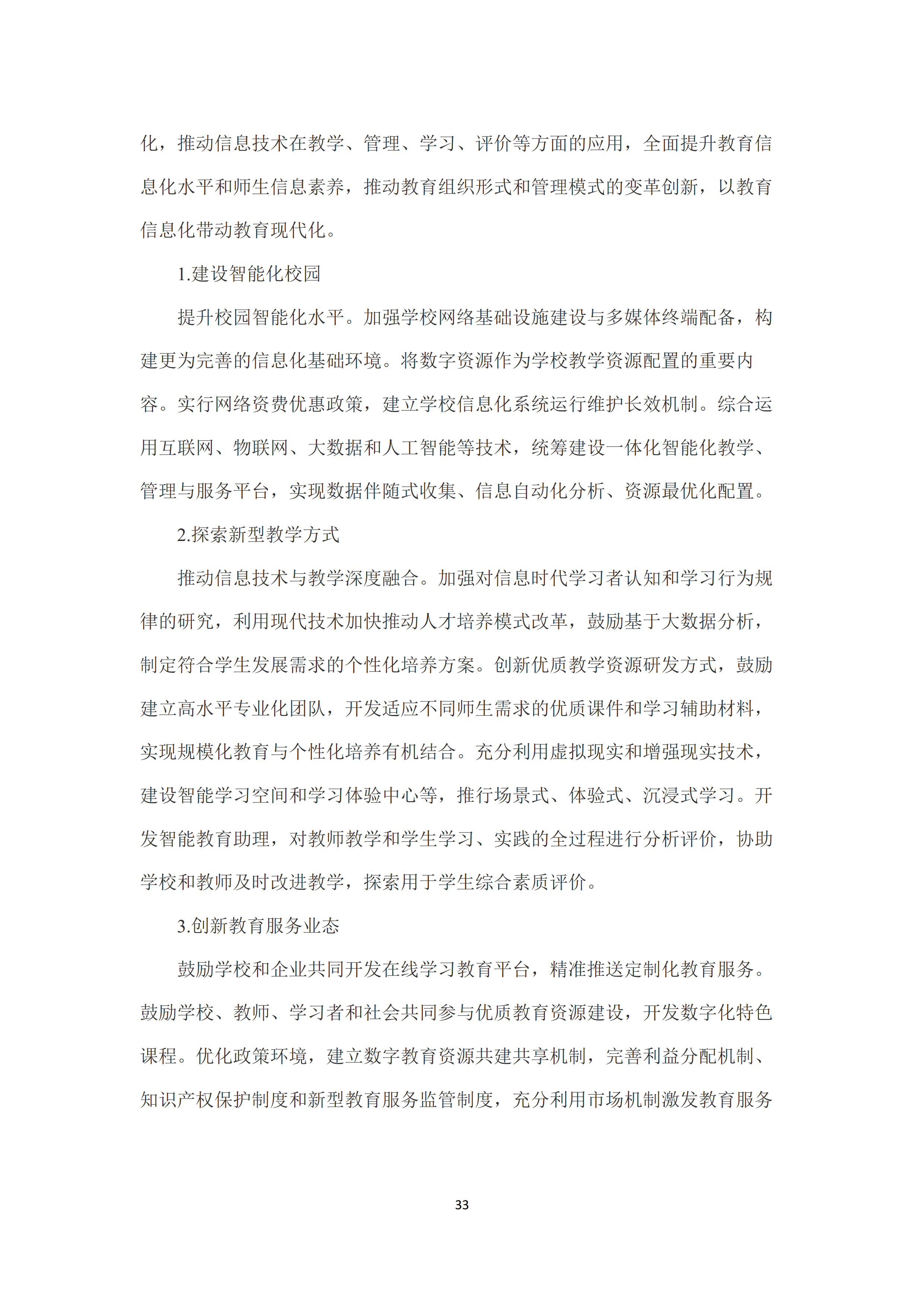 八是加快信息化时代教育变革。建设智能化校园,统筹建设一体化智能化教学、管理与服务平台。利用现代技术加快推动人才培养模式改革,实现规模化教育与个性化培养的有机结合。创新教育服务业态,建立数字教育资源共建共享机制,完善利益分配机制、知识产权保护制度和新型教育服务监管制度。推进教育治理方式变革,加快形成现代化的教育管理与监测体系,推进管理精准化和决策科学化。