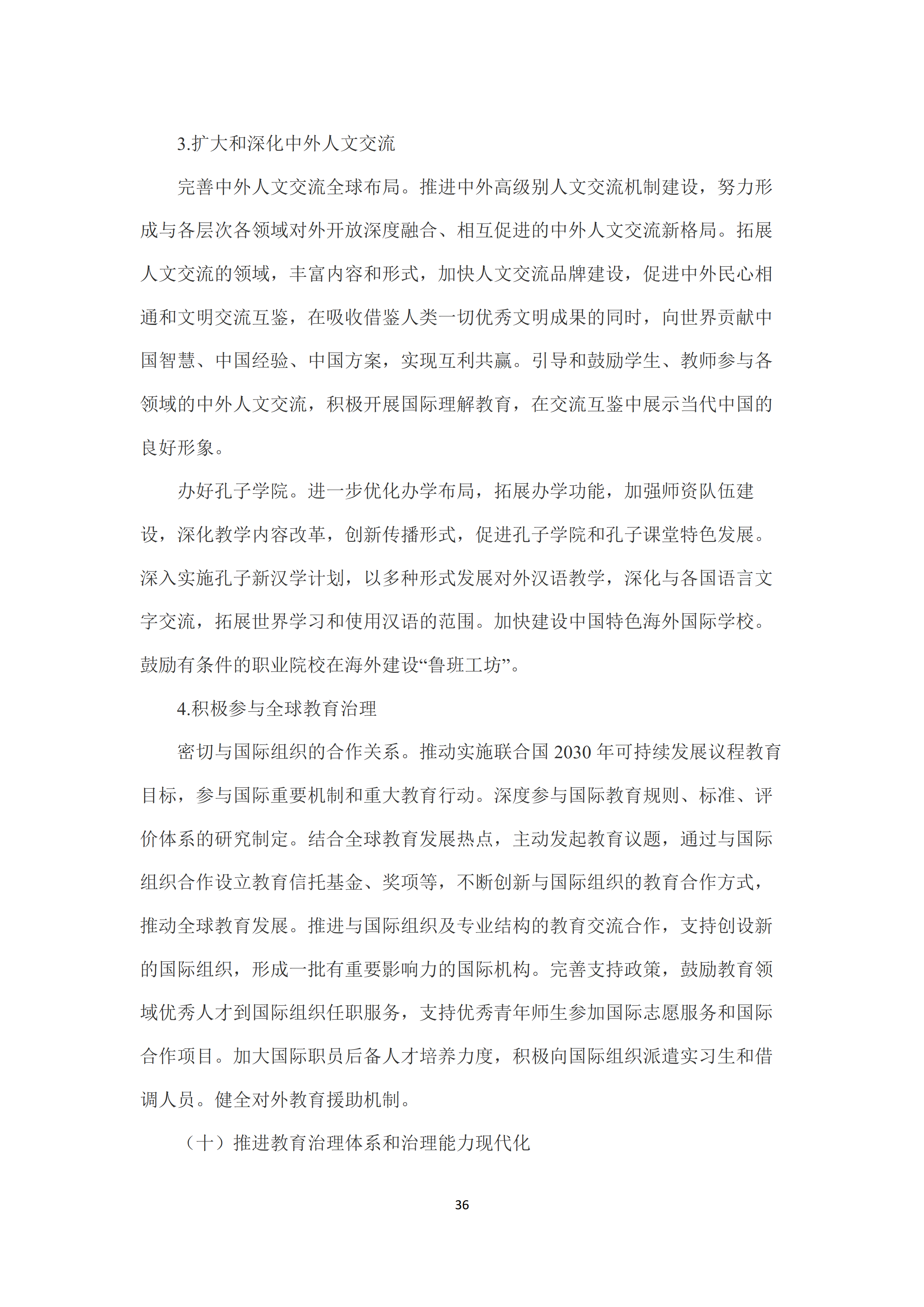 九是开创教育对外开放新格局。全面提升国际交流合作水平,推动我国同其他国家学历学位互认、标准互通、经验互鉴。扎实推进“一带一路”教育行动。加强与联合国教科文组织等国际组织和多边组织的合作。提升中外合作办学质量。优化出国留学服务。实施留学中国计划,建立并完善来华留学教育质量保障机制,全面提升来华留学质量。推进中外高级别人文交流机制建设,拓展人文交流领域,促进中外民心相通和文明交流互鉴。促进孔子学院和孔子课堂特色发展。加快建设中国特色海外国际学校。鼓励有条件的职业院校在海外建设“鲁班工坊”。积极参与全球教育治理,深度参与国际教育规则、标准、评价体系的研究制定。推进与国际组织及专业机构的教育交流合作。健全对外教育援助机制。