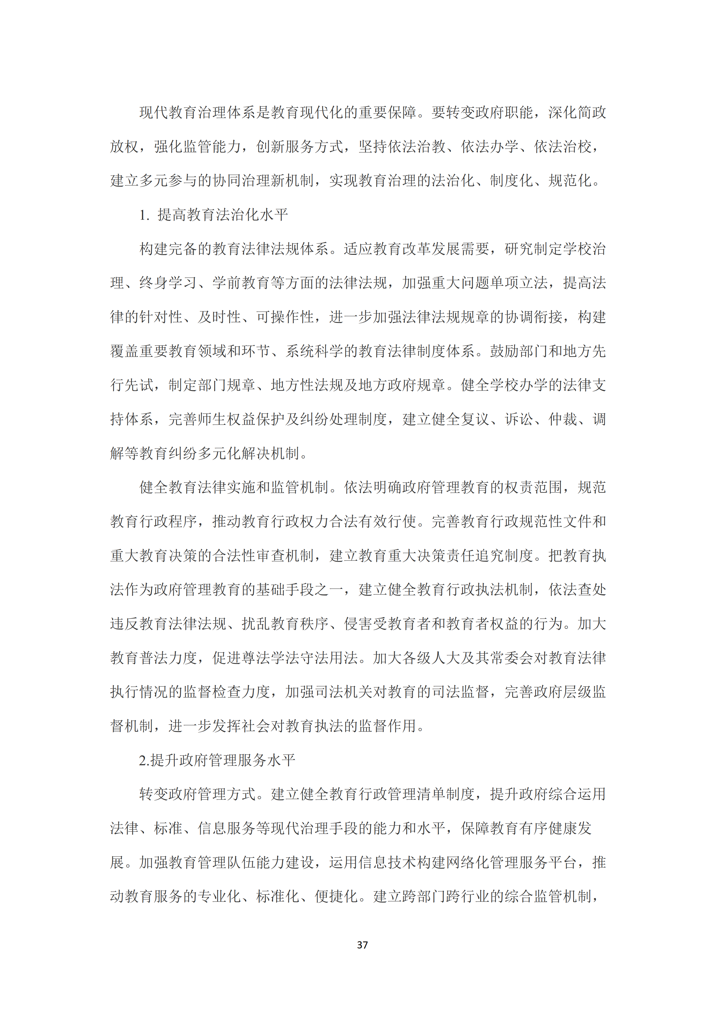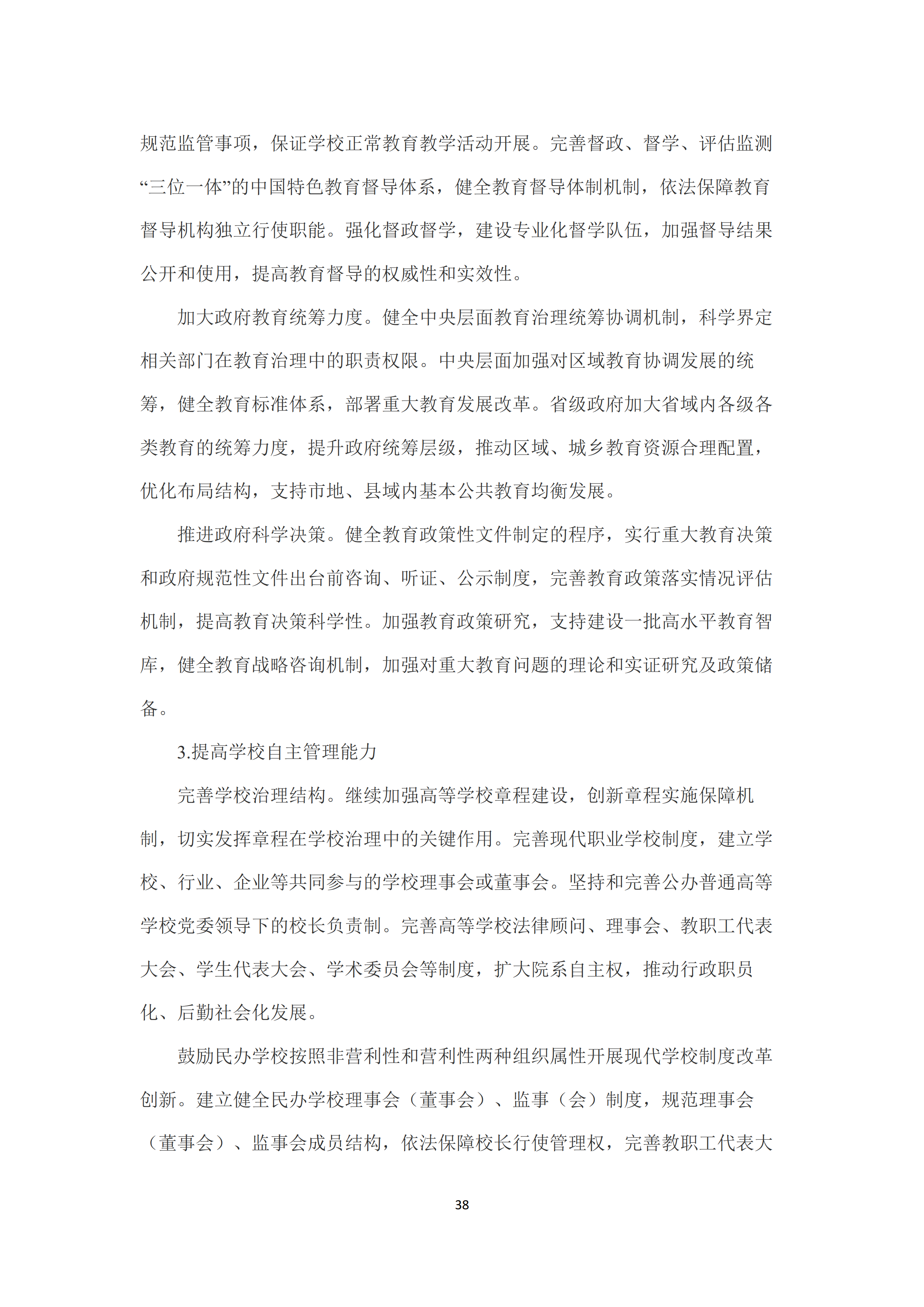 十是推进教育治理体系和治理能力现代化。提高教育法治化水平,构建完备的教育法律法规体系,健全学校办学法律支持体系。健全教育法律实施和监管机制。提升政府管理服务水平,提升政府综合运用法律、标准、信息服务等现代治理手段的能力和水平。健全教育督导体制机制,提高教育督导的权威性和实效性。提高学校自主管理能力,完善学校治理结构,继续加强高等学校章程建设。鼓励民办学校按照非营利性和营利性两种组织属性开展现代学校制度改革创新。推动社会参与教育治理常态化,建立健全社会参与学校管理和教育评价监管机制。
