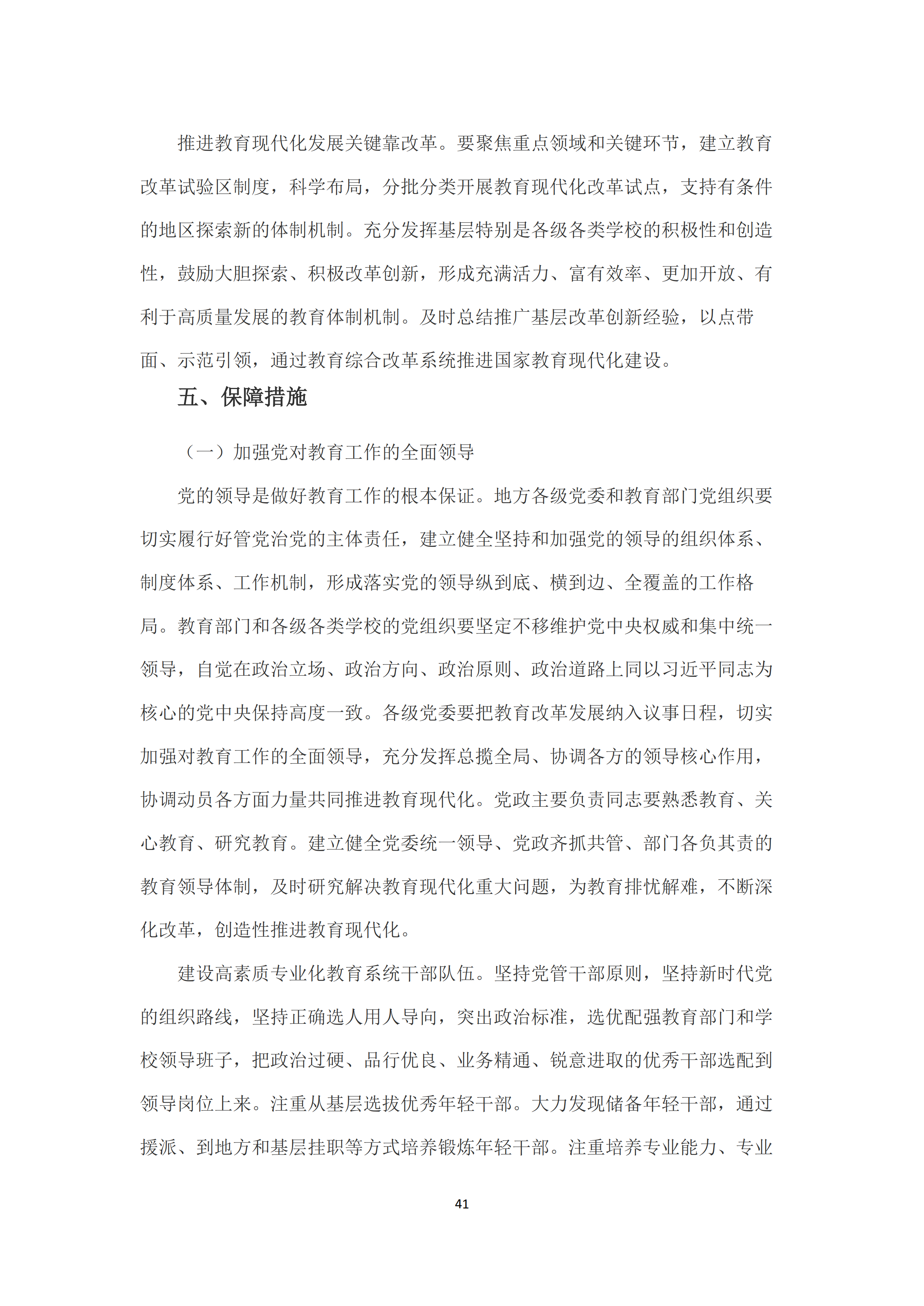 一是加强党对教育工作的全面领导。各级党委要把教育改革发展纳入议事日程,协调动员各方面力量共同推进教育现代化。建立健全党委统一领导、党政齐抓共管、部门各负其责的教育领导体制。建设高素质专业化教育系统干部队伍。加强各级各类学校党的领导和党的建设工作。深入推进教育系统全面从严治党、党风廉政建设和反腐败斗争。