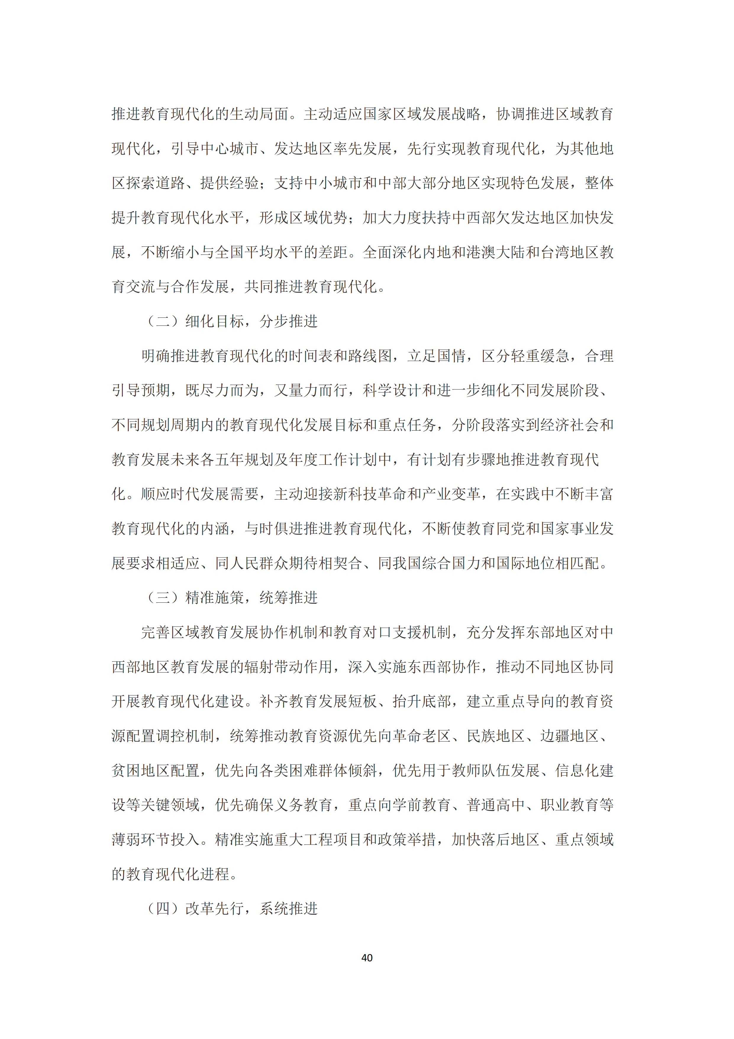 《中国教育现代化2035》明确了实现教育现代化的实施路径:一是总体规划,分区推进。在国家教育现代化总体规划框架下,推动各地从实际出发,制定本地区教育现代化规划,形成一地一案、分区推进教育现代化的生动局面。二是细化目标,分步推进。科学设计和进一步细化不同发展阶段、不同规划周期内的教育现代化发展目标和重点任务,有计划有步骤地推进教育现代化。三是精准施策,统筹推进。完善区域教育发展协作机制和教育对口支援机制,深入实施东西部协作,推动不同地区协同推进教育现代化建设。四是改革先行,系统推进。充分发挥基层特别是各级各类学校的积极性和创造性,鼓励大胆探索、积极改革创新,形成充满活力、富有效率、更加开放、有利于高质量发展的教育体制机制。