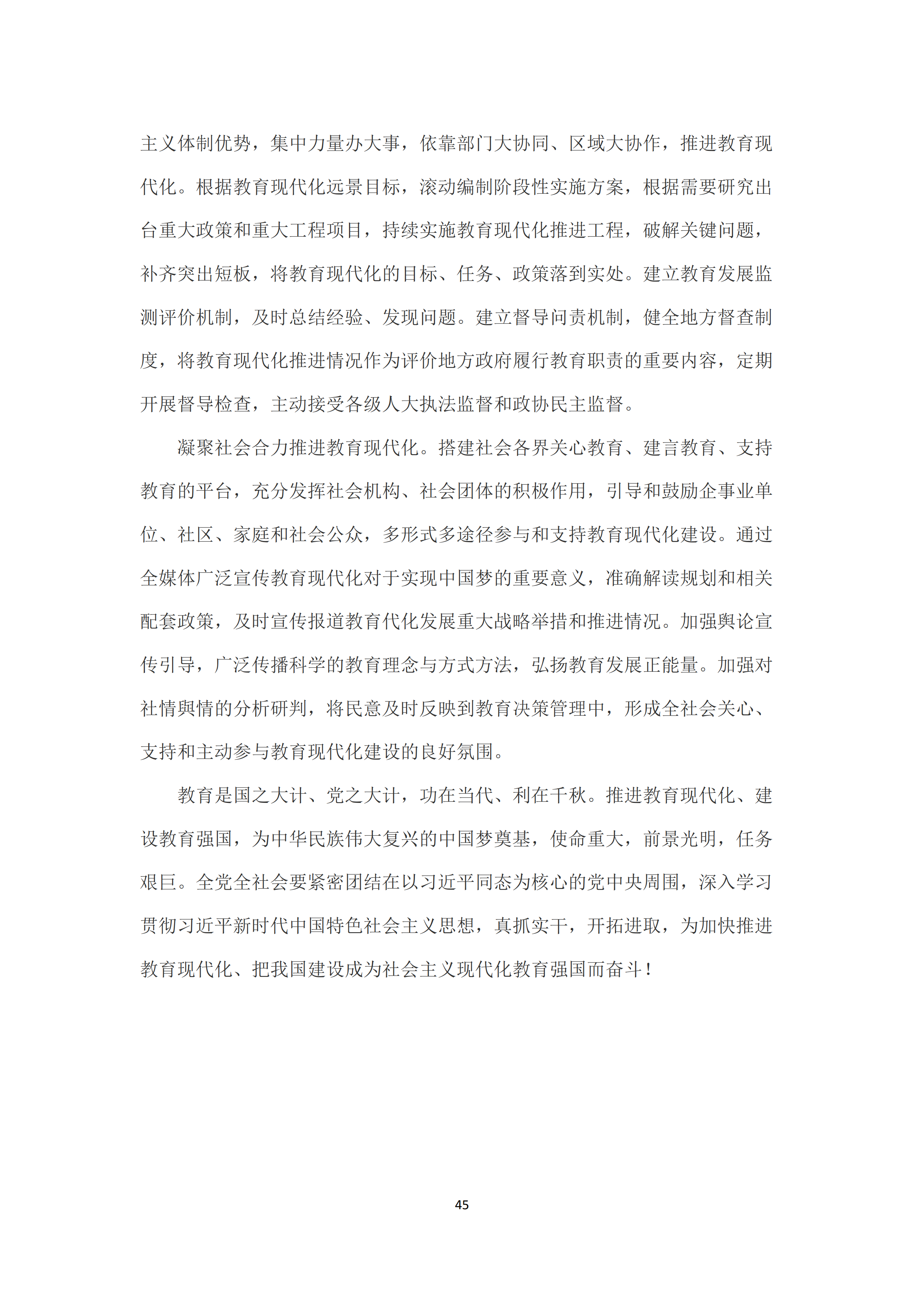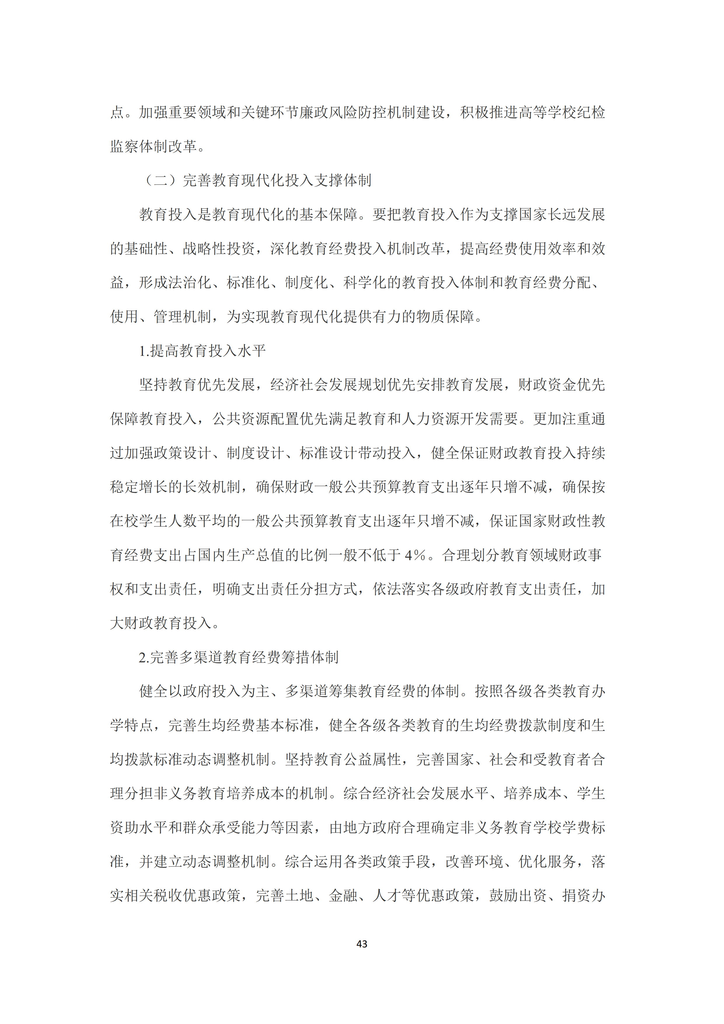 二是完善教育现代化投入支撑体制。健全保证财政教育投入持续稳定增长的长效机制,确保财政一般公共预算教育支出逐年只增不减,确保按在校学生人数平均的一般公共预算教育支出逐年只增不减,保证国家财政性教育经费支出占国内生产总值的比例一般不低于4%。依法落实各级政府教育支出责任,完善多渠道教育经费筹措体制,完善国家、社会和受教育者合理分担非义务教育培养成本的机制,支持和规范社会力量兴办教育。优化教育经费使用结构,全面实施绩效管理,建立健全全覆盖全过程全方位的教育经费监管体系,全面提高经费使用效益。