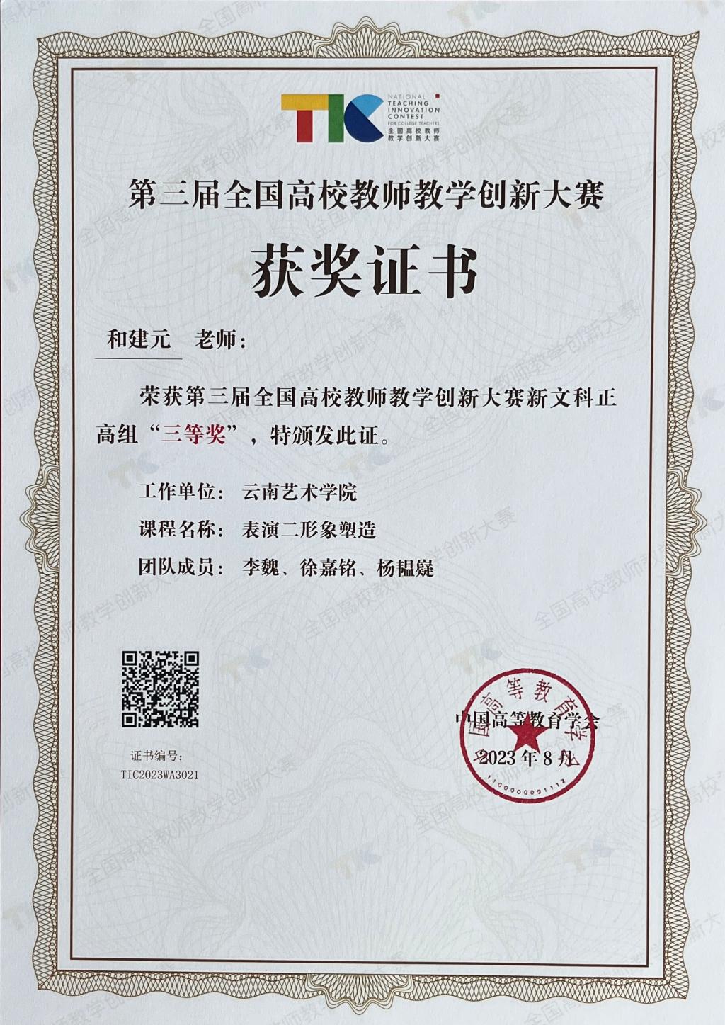“第三届全国高校教师教学创新大赛”由教育部高等教育司指导,中国高等教育学会主办。大赛聚焦教学创新、融合课程思政、强化“四新”建设,促进教师更新教育理念、锤炼教学基本功、掌握现代教学方法。2022年12月beat365启动校赛以来,学校领导高度重视,教学单位积极配合,教务处、人事处协同开展大赛相关工作,邀请全国知名专家围绕教学创新主题,开展教学创新设计、获奖经验分享等系列培训活动。经过校赛和省赛的激烈角逐,徐梅老师团队与和建元老师团队获省赛特等奖,获推参加国赛。其中,徐梅老师团队在国赛第一阶段的比拼中再次胜出,参加了8月19—22日在浙江大学举行的现场赛。在比赛中,徐梅老师沉着冷静、自然大方、娴熟自如,展现出了云艺教师良好的精神风貌、较高的专业素养和过硬的教学本领。